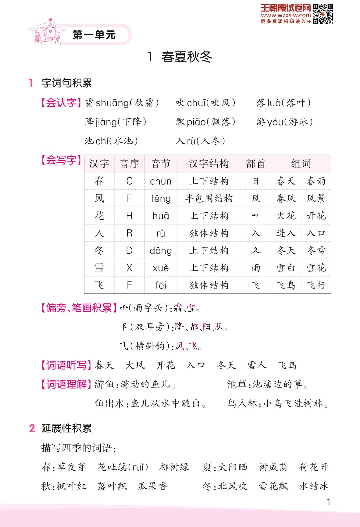 2023下册一年级语文人教版 助学手册 第一单元——1 春夏秋冬