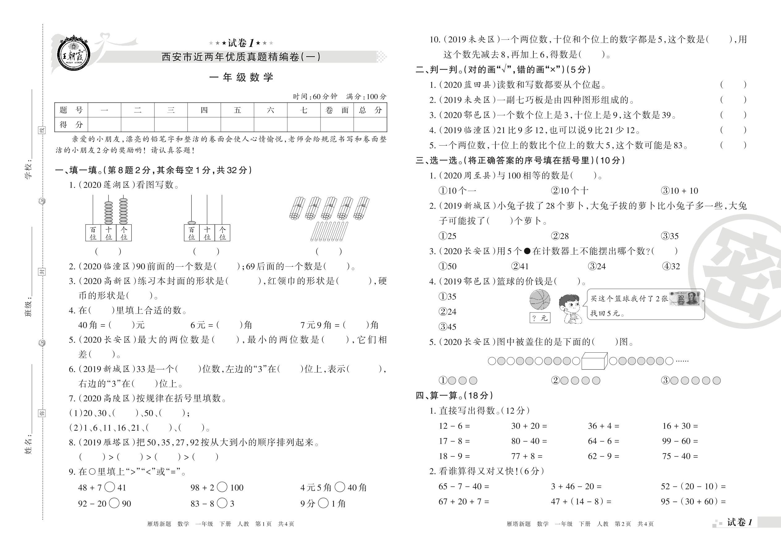 优质试题精编卷(一)一年级下册数学(人教版)【1】