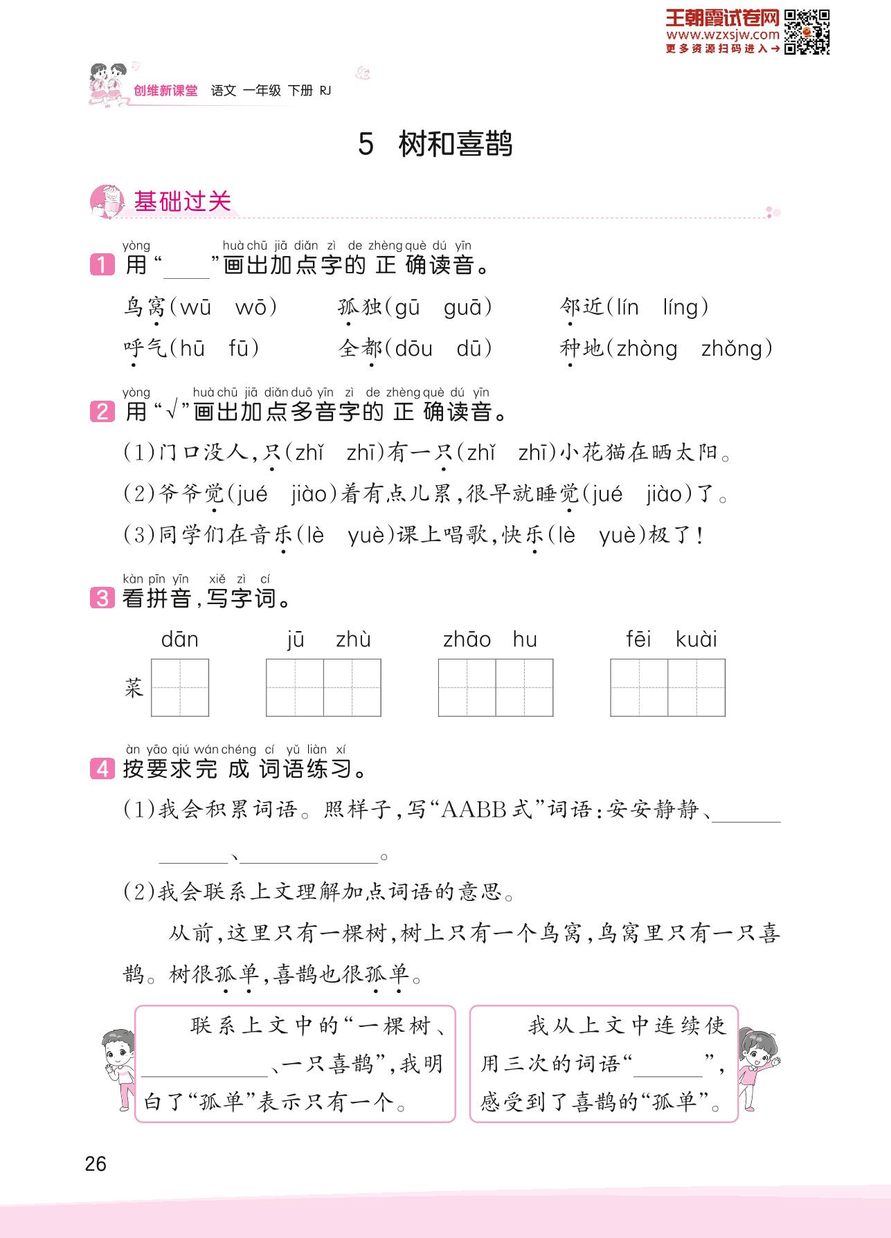 2023下册一年级语文人教版 第三单元 伙伴——5 树和喜鹊