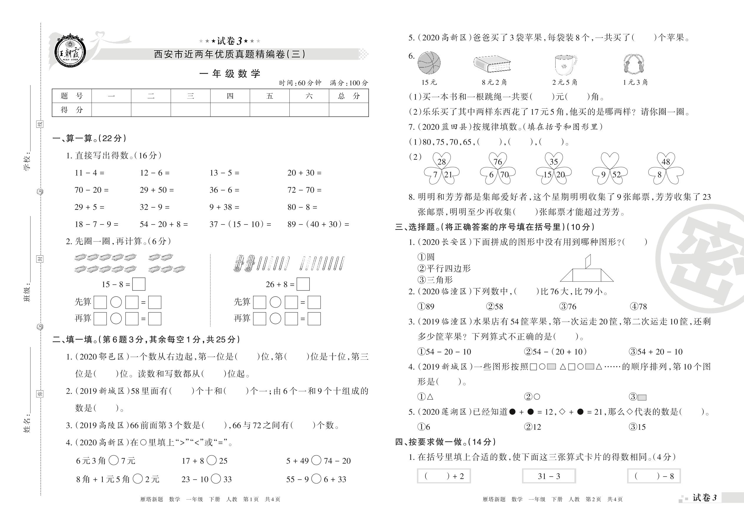 优质试题精编卷(三)一年级下册数学(人教版)【3】