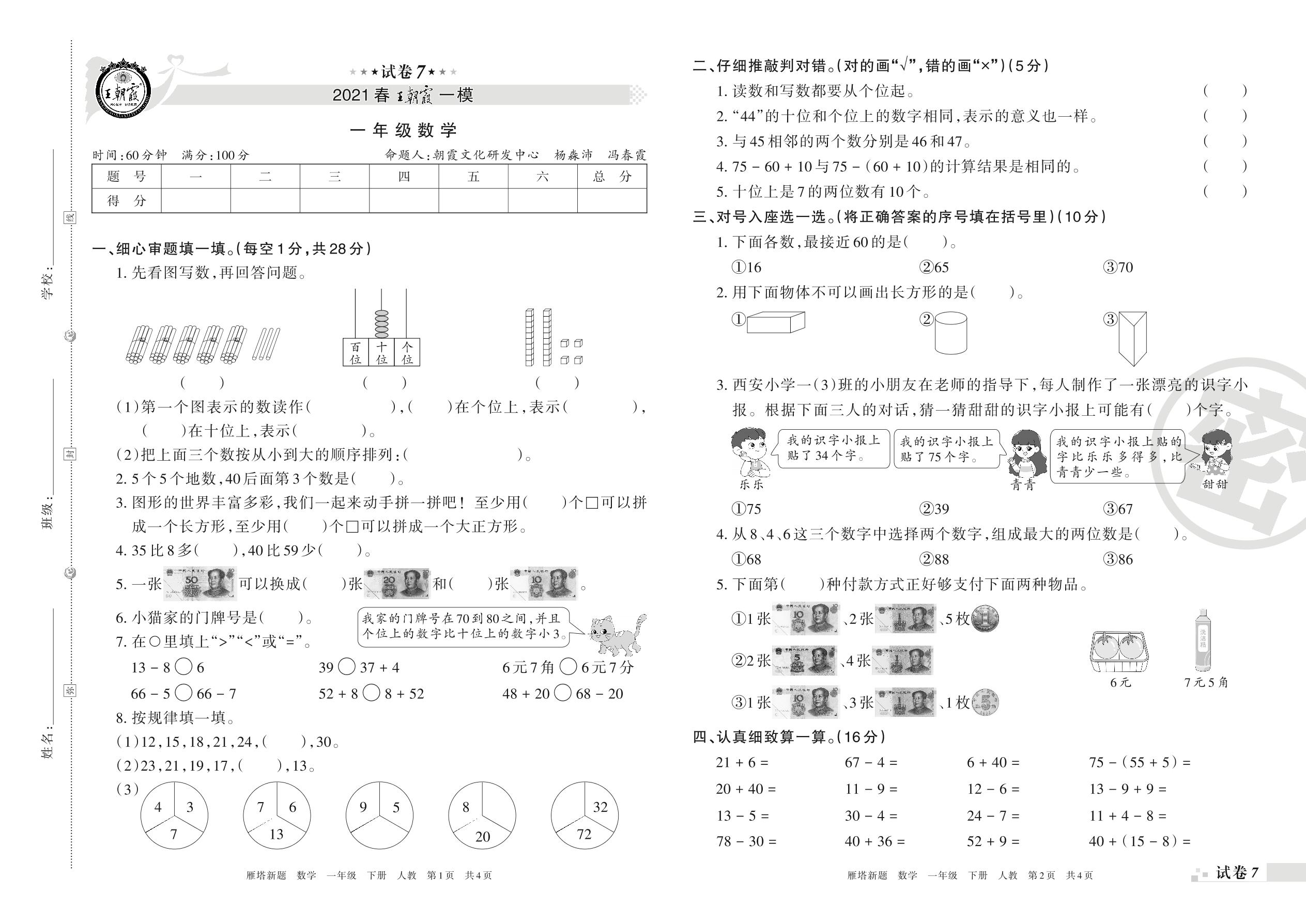 王朝霞期末模拟卷一年级下册数学(人教版)_R210802205104【7】