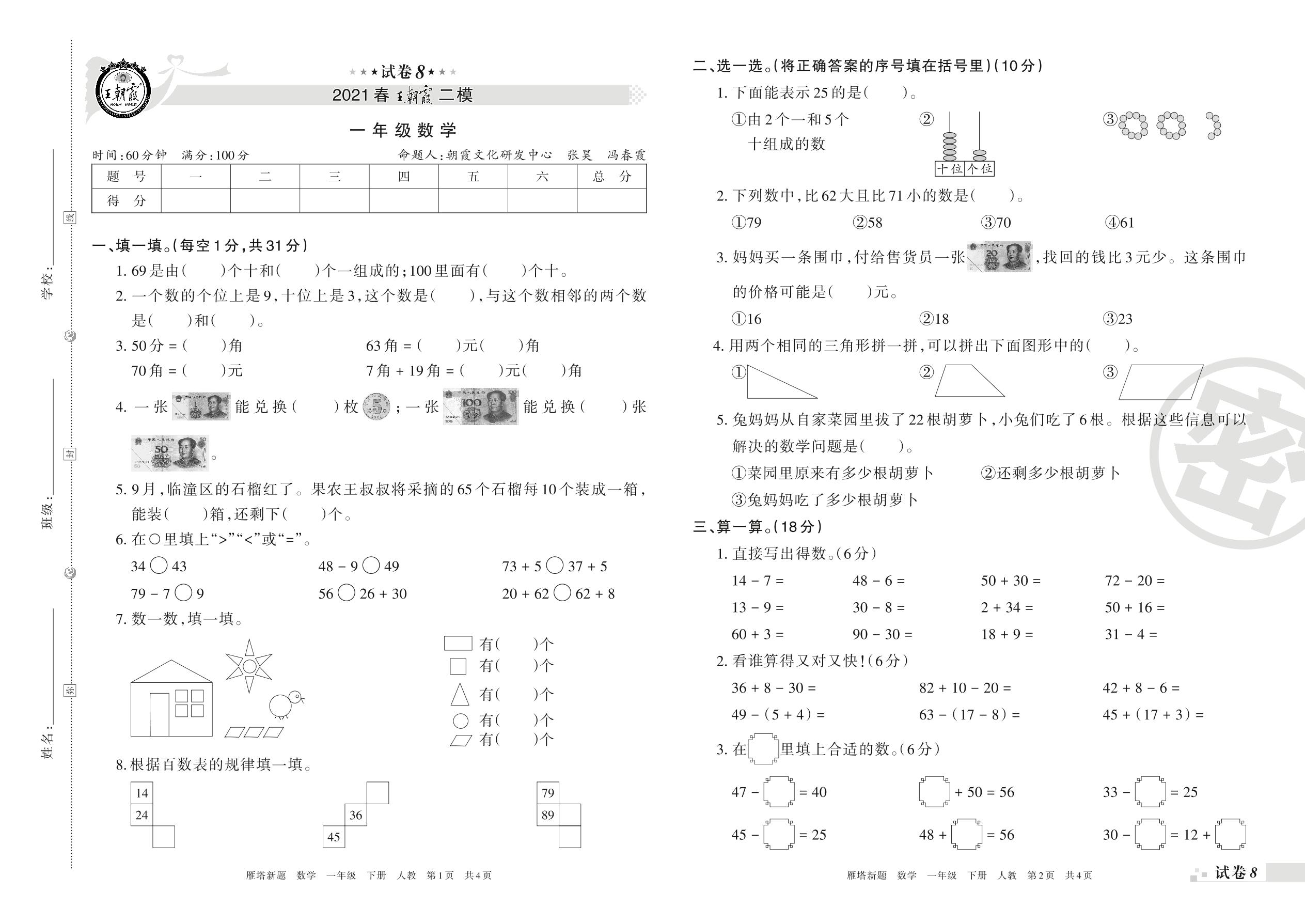 王朝霞期末模拟卷一年级下册数学(人教版)_R210802205107【8】