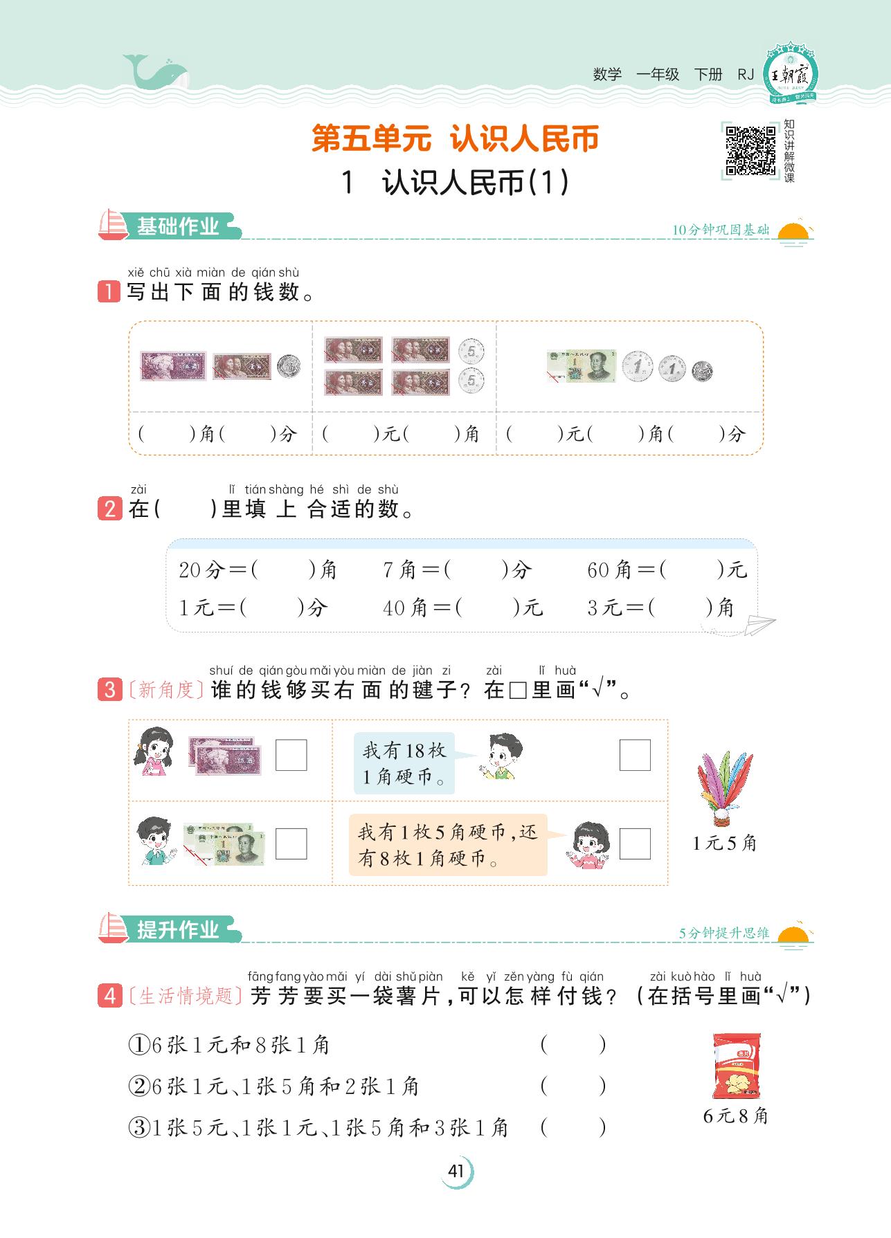 2023下册一年级数学人教版 第五单元 认识人民币——1 认识人民币(1)