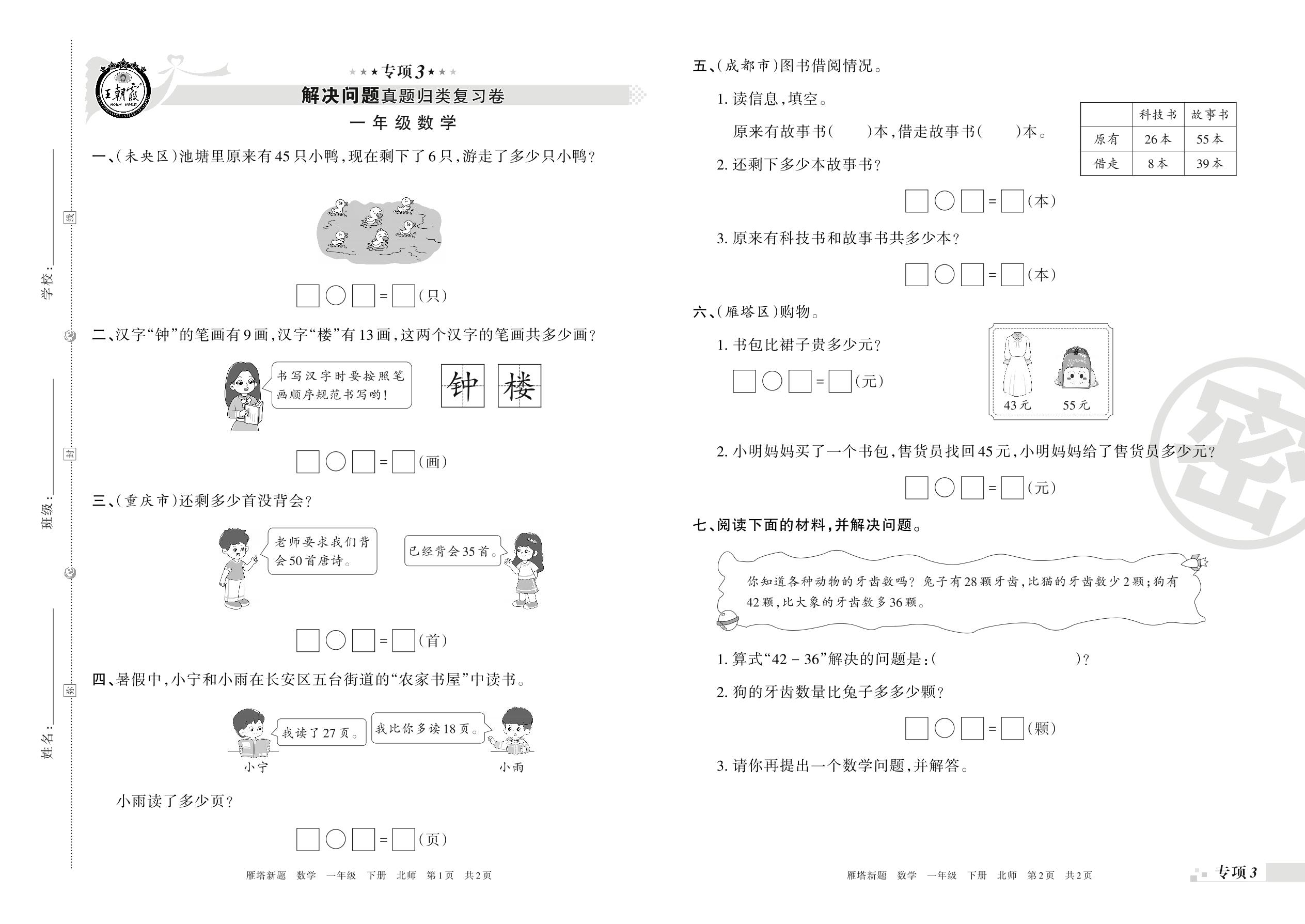 王朝霞期末专项卷——解决问题真题归类复习、新颖题速递:生活与数学一年级下册数学(北师版)_R210802205121【0】