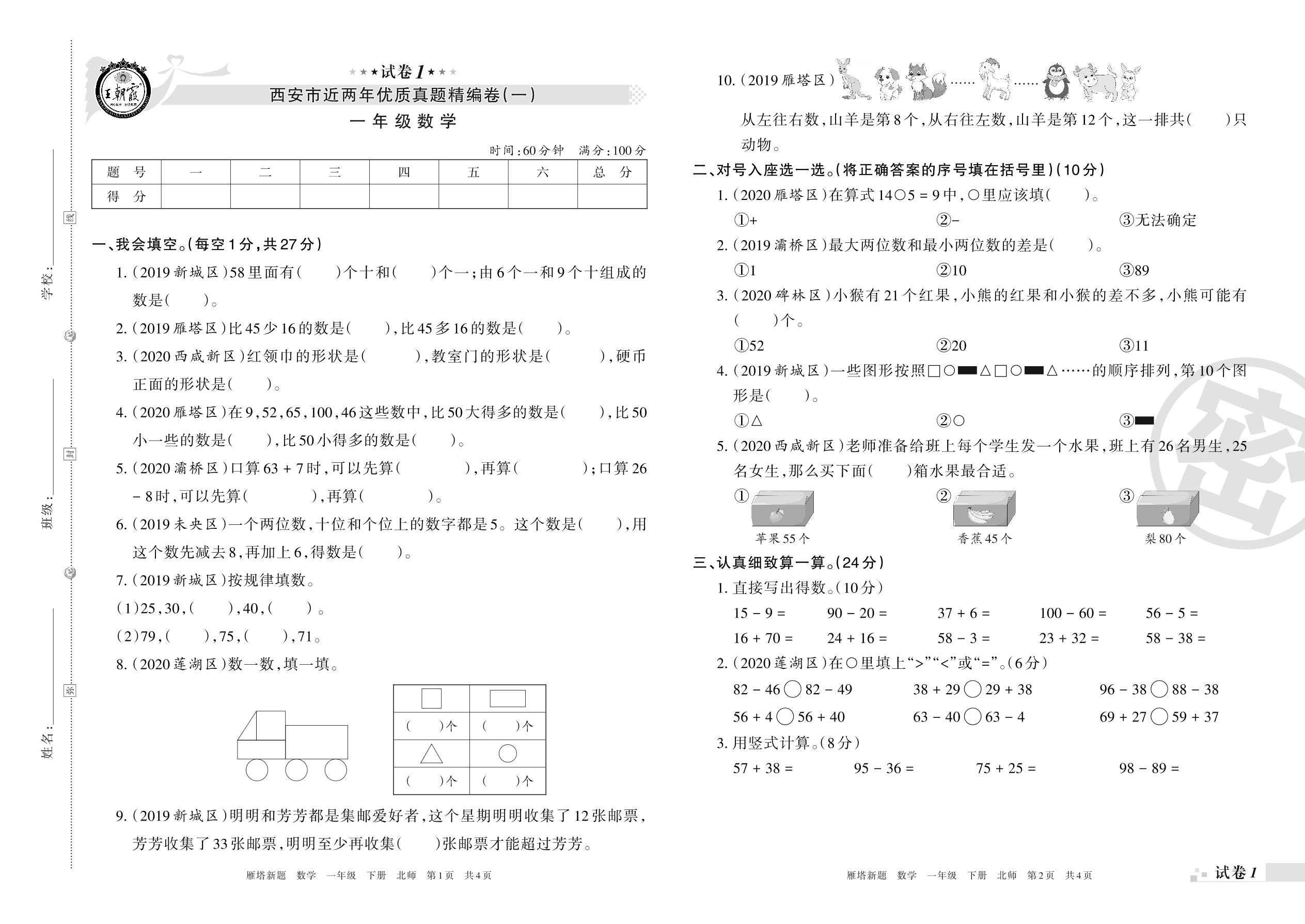优质试题精编卷(一)一年级下册数学(北师版)【1】