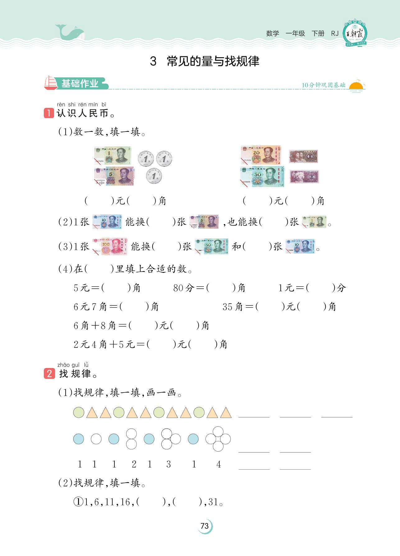 2023下册一年级数学人教版 第八单元 总复习——3 常见的量与找规律