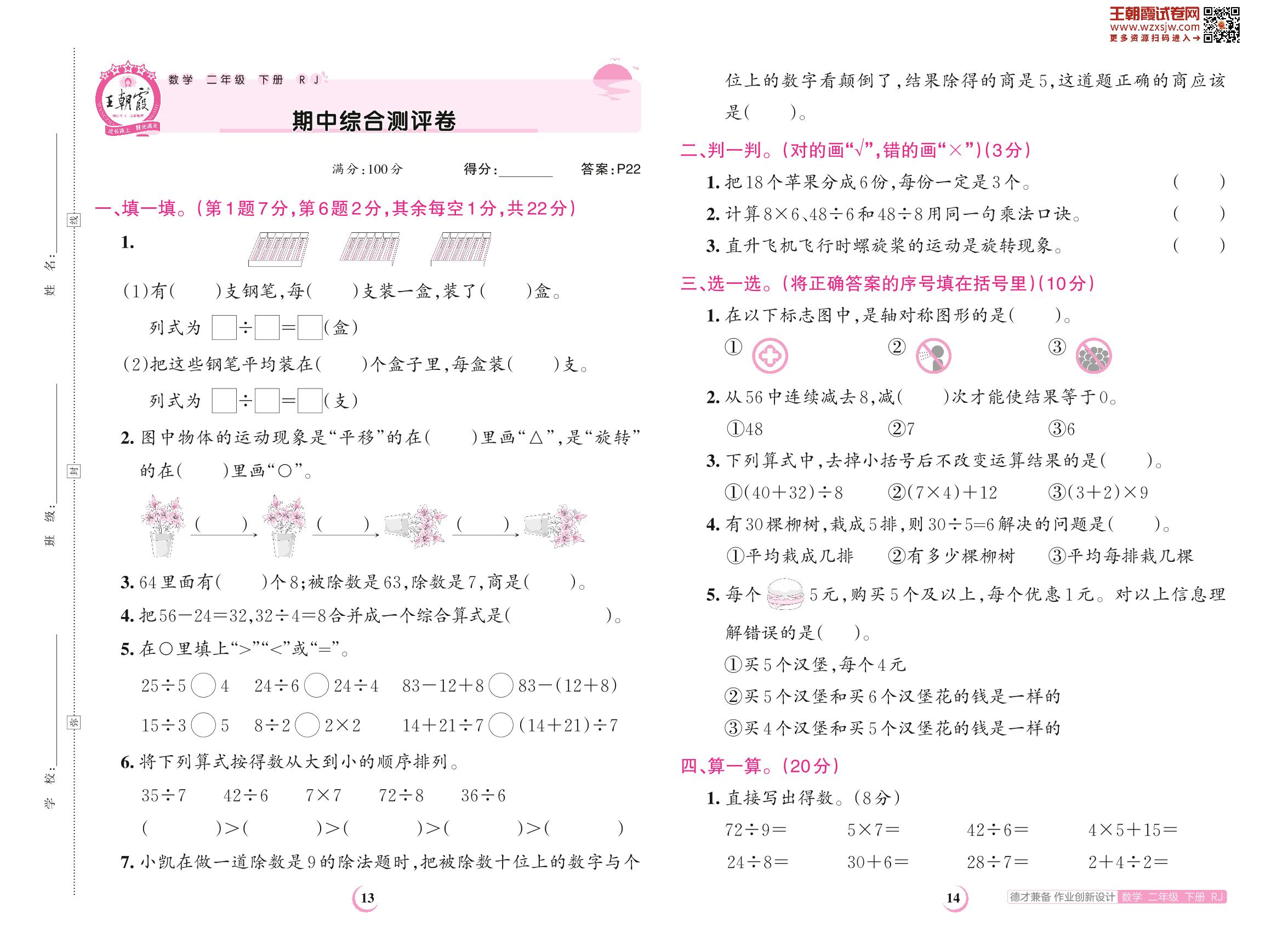 二年级数学人教版下册期中卷