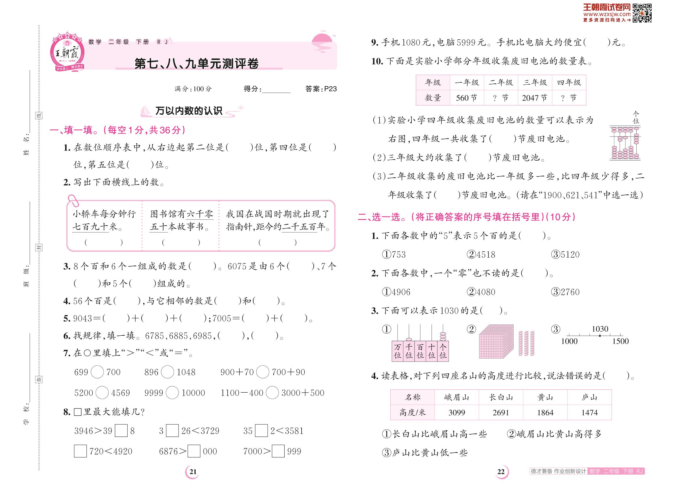 2023下册二年级数学人教版 第七、八、九单元测评卷