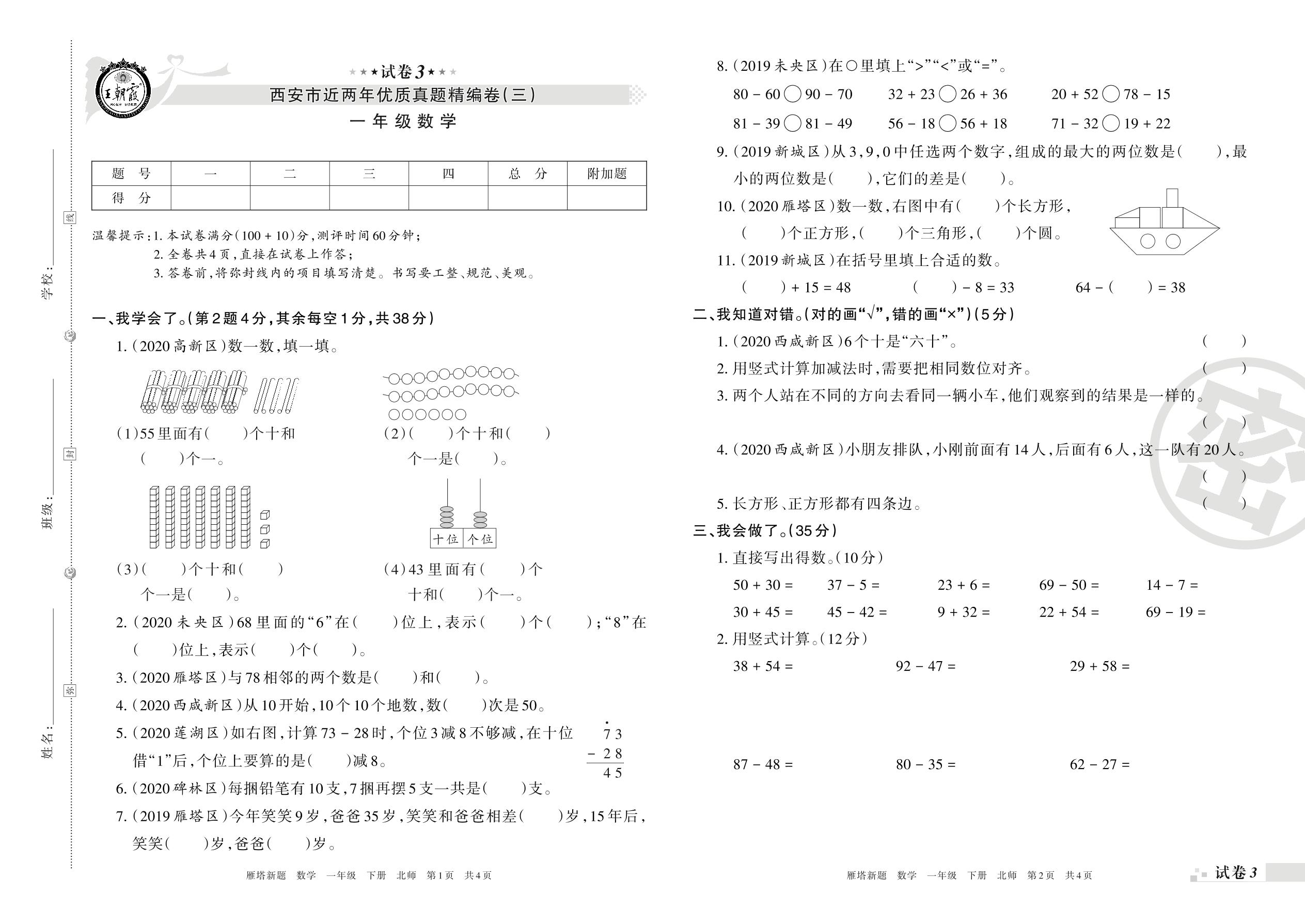 优质试题精编卷(三)一年级下册数学(北师版)【3】
