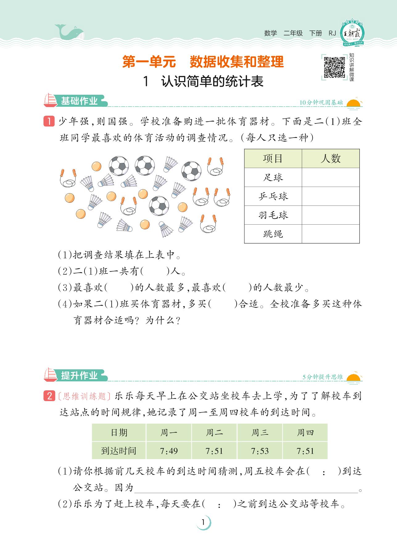 2023下册二年级数学人教版 第一单元 数据收集和整理——1 认识简单的统计表