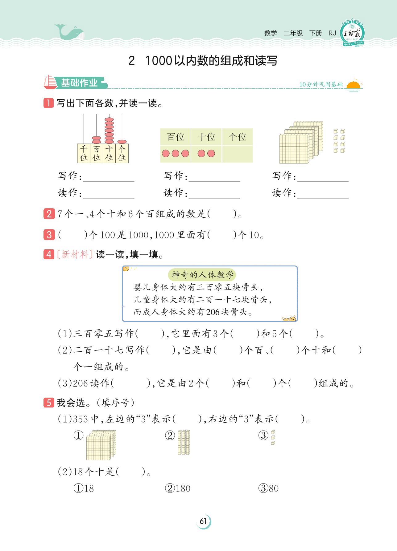 2023下册二年级数学人教版 第七单元 万以内数的认识——2 1000以内数的组成和读写