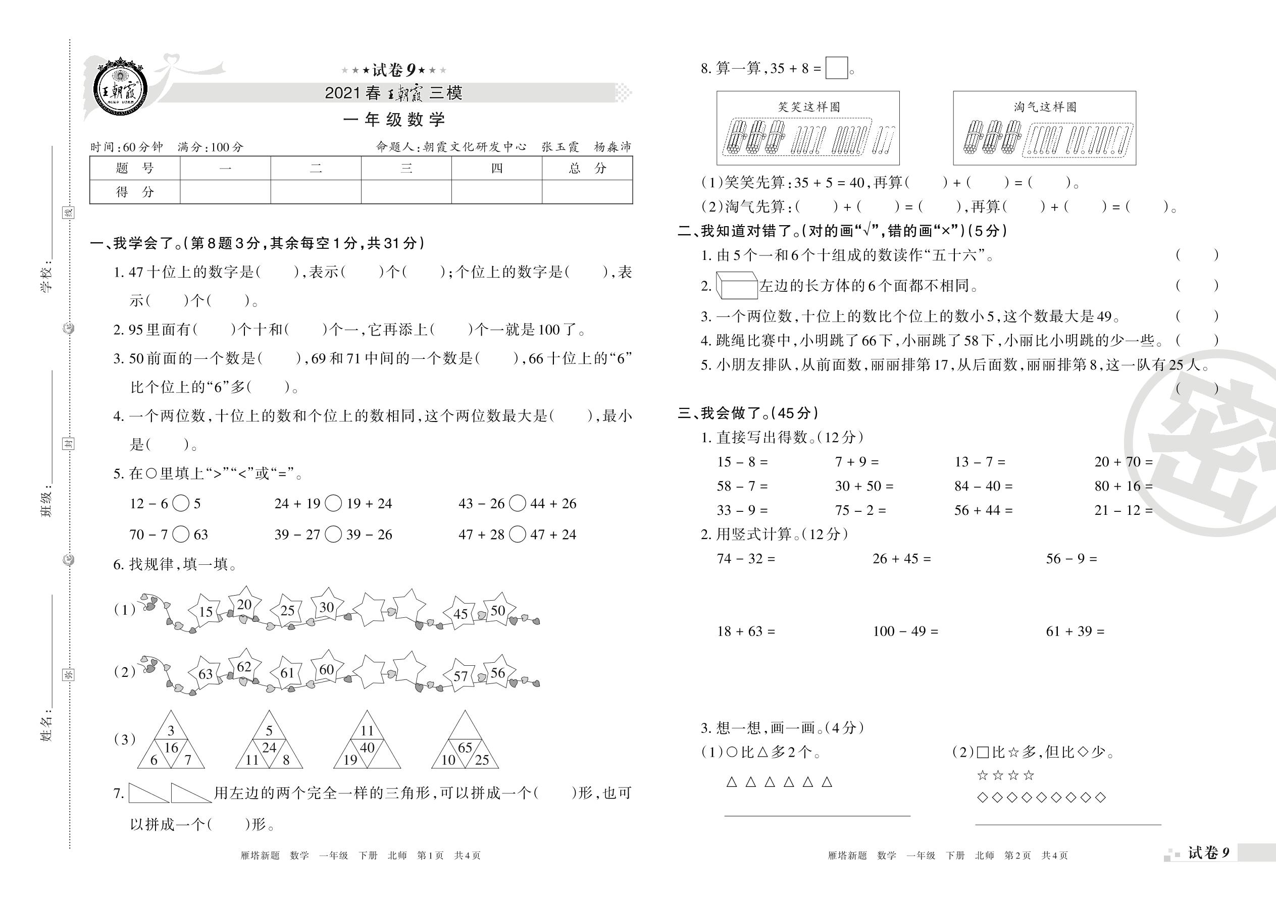 王朝霞期末模拟卷一年级下册数学(北师版)_R210802205145【9】