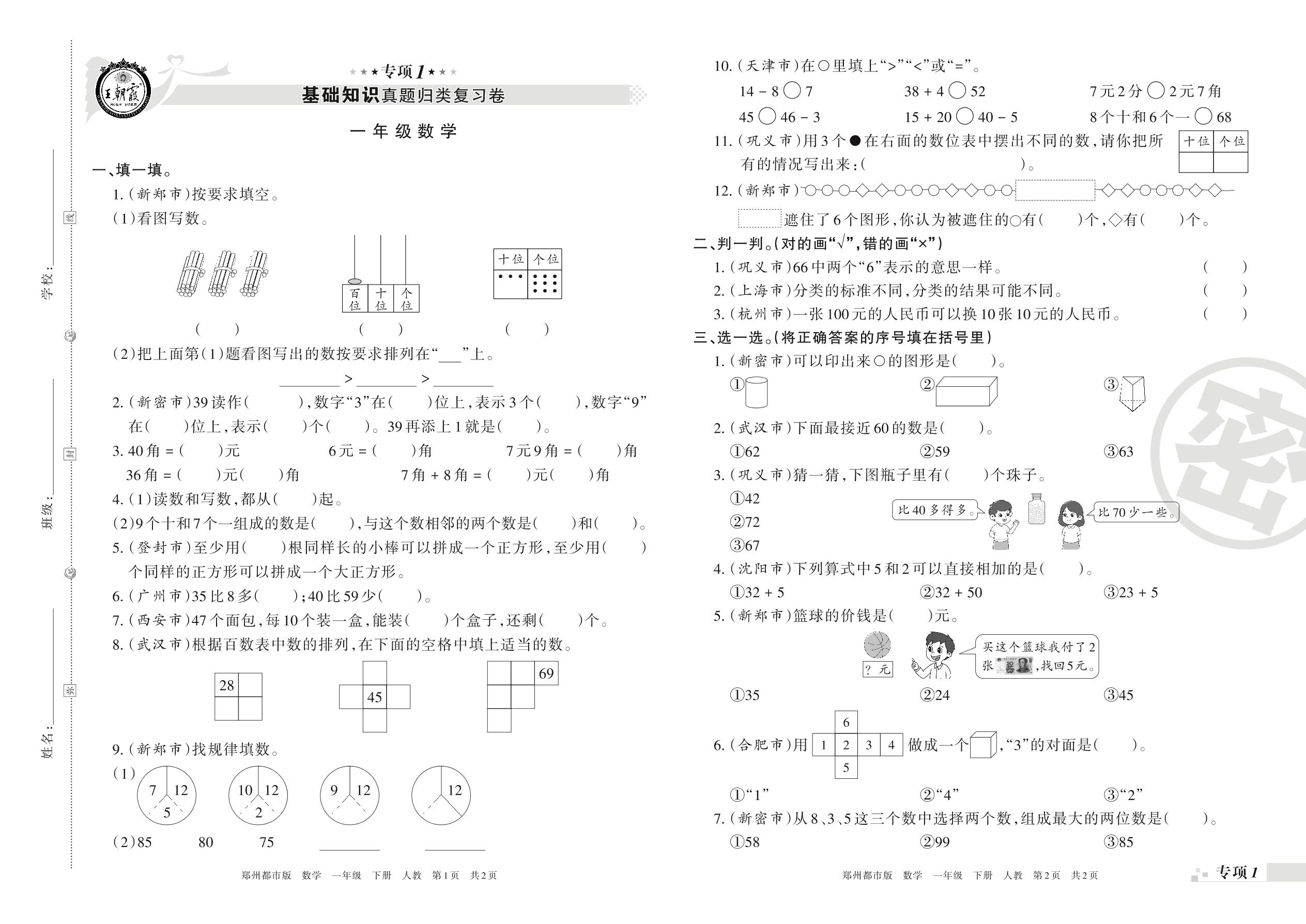 王朝霞期末专项卷——基础知识、计算真题归类复习一年级下册数学(人教版)_R210802205157【0】