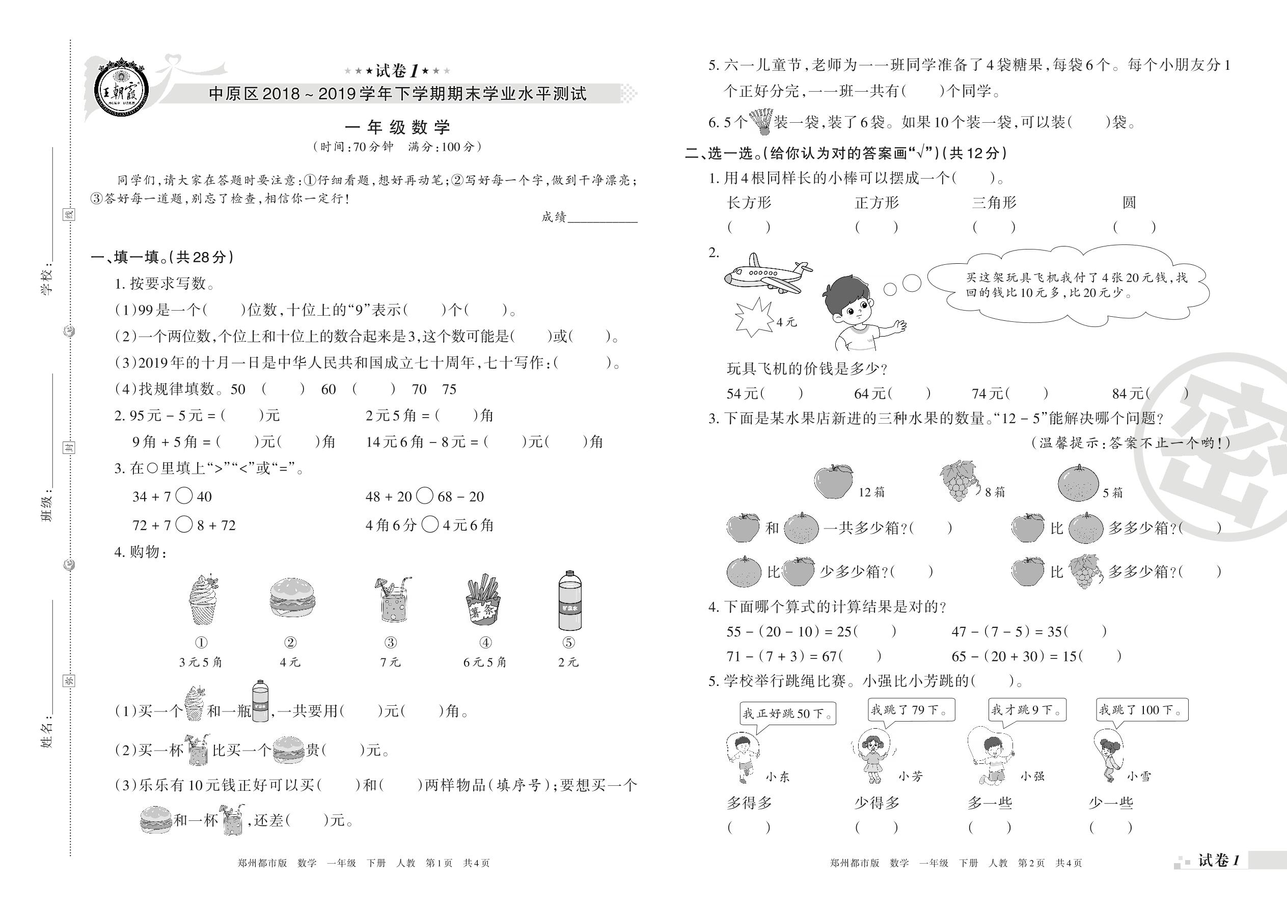 2018-2019学年第二学期郑州市中原区一年级数学试卷(人教版)【1】
