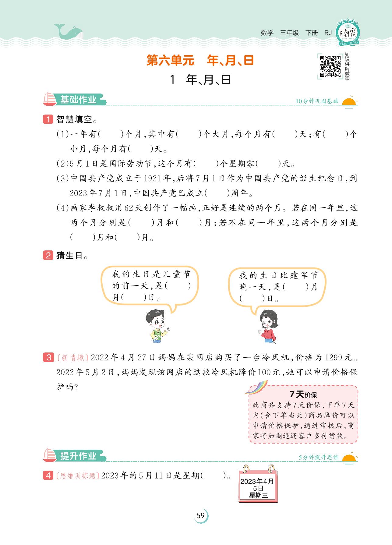 2023下册三年级数学人教版 第六单元 年、月、日——1 年、月、日