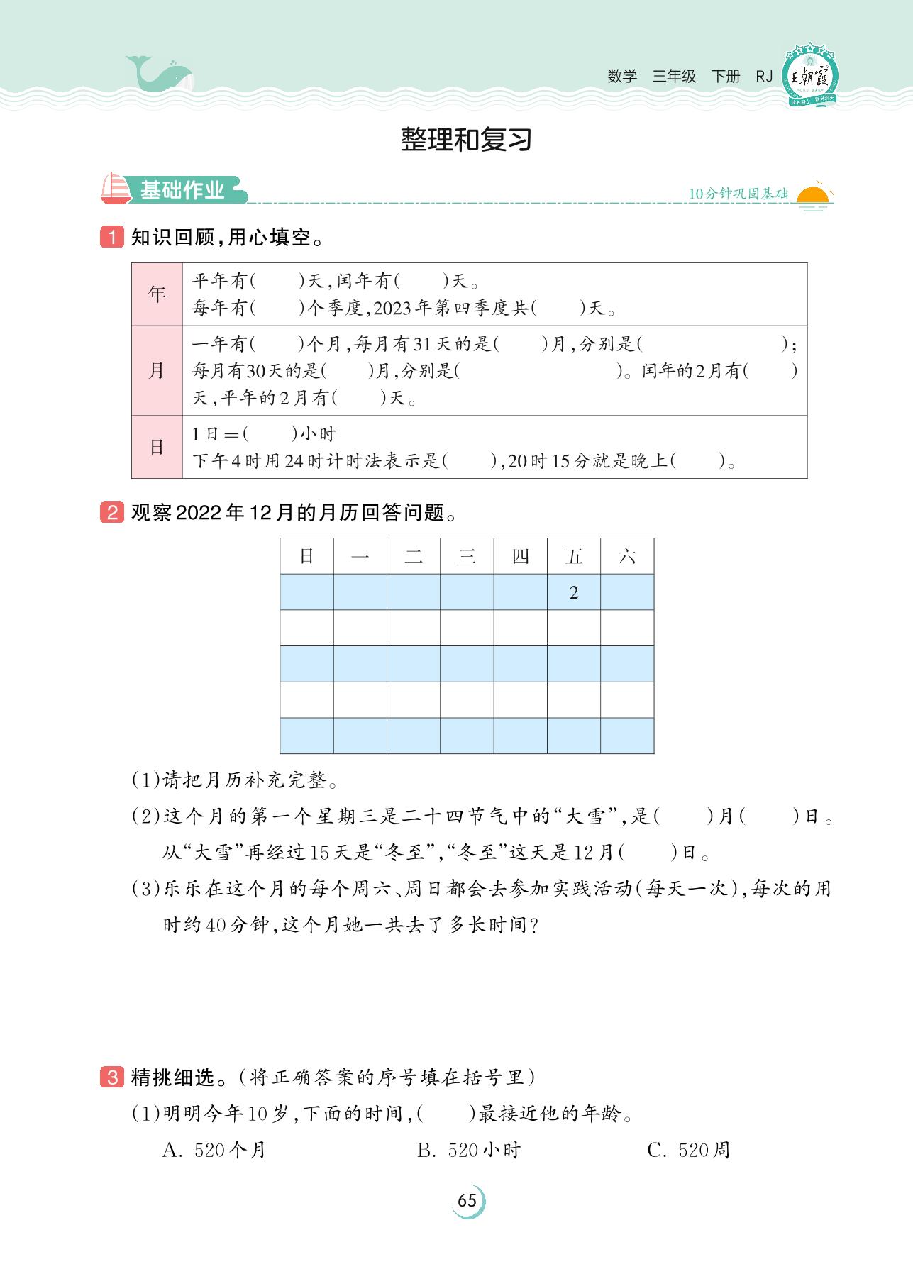 2023下册三年级数学人教版 第六单元 年、月、日——整理和复习