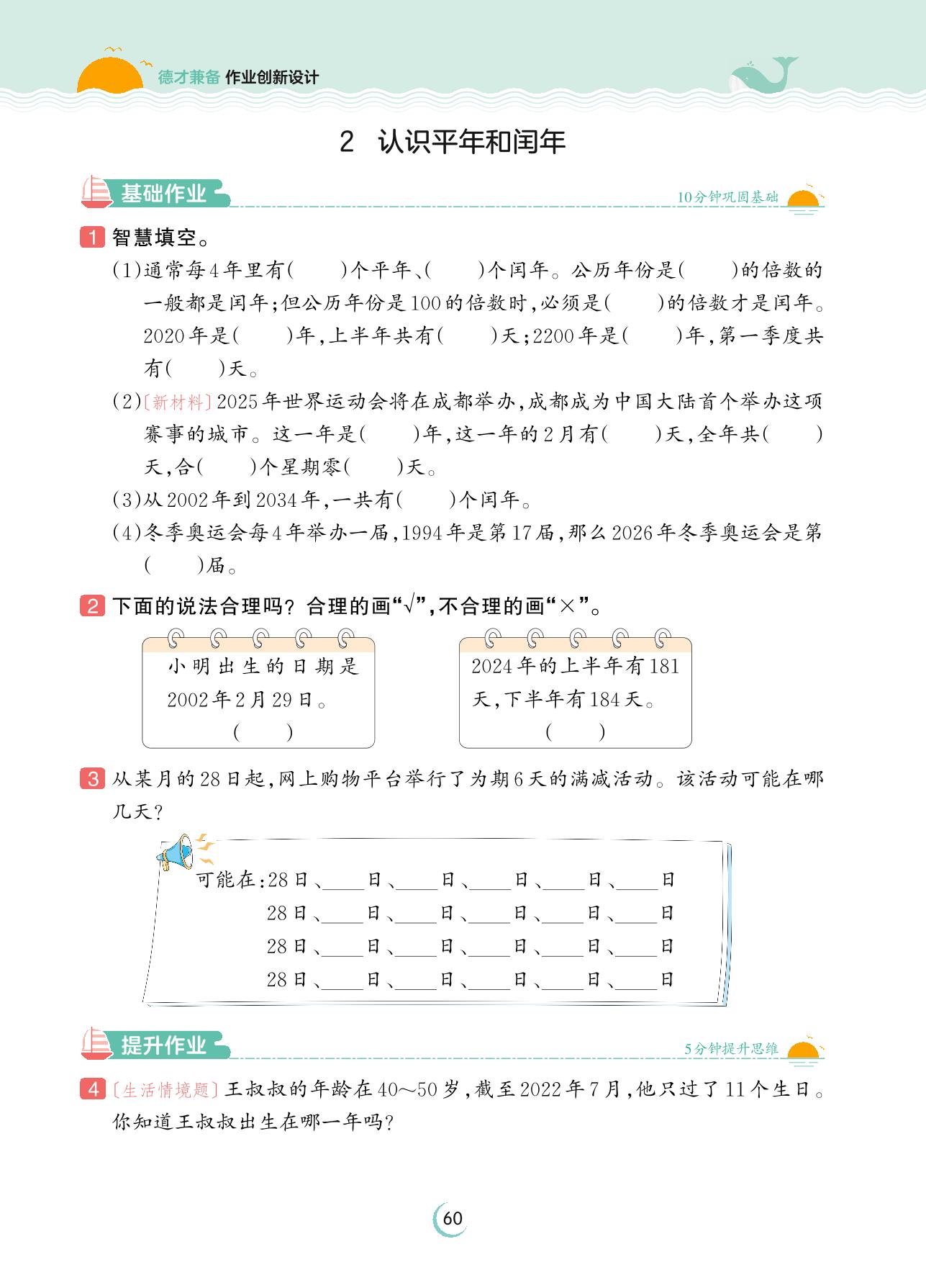 2023下册三年级数学人教版 第六单元 年、月、日——2 认识平年和闰年