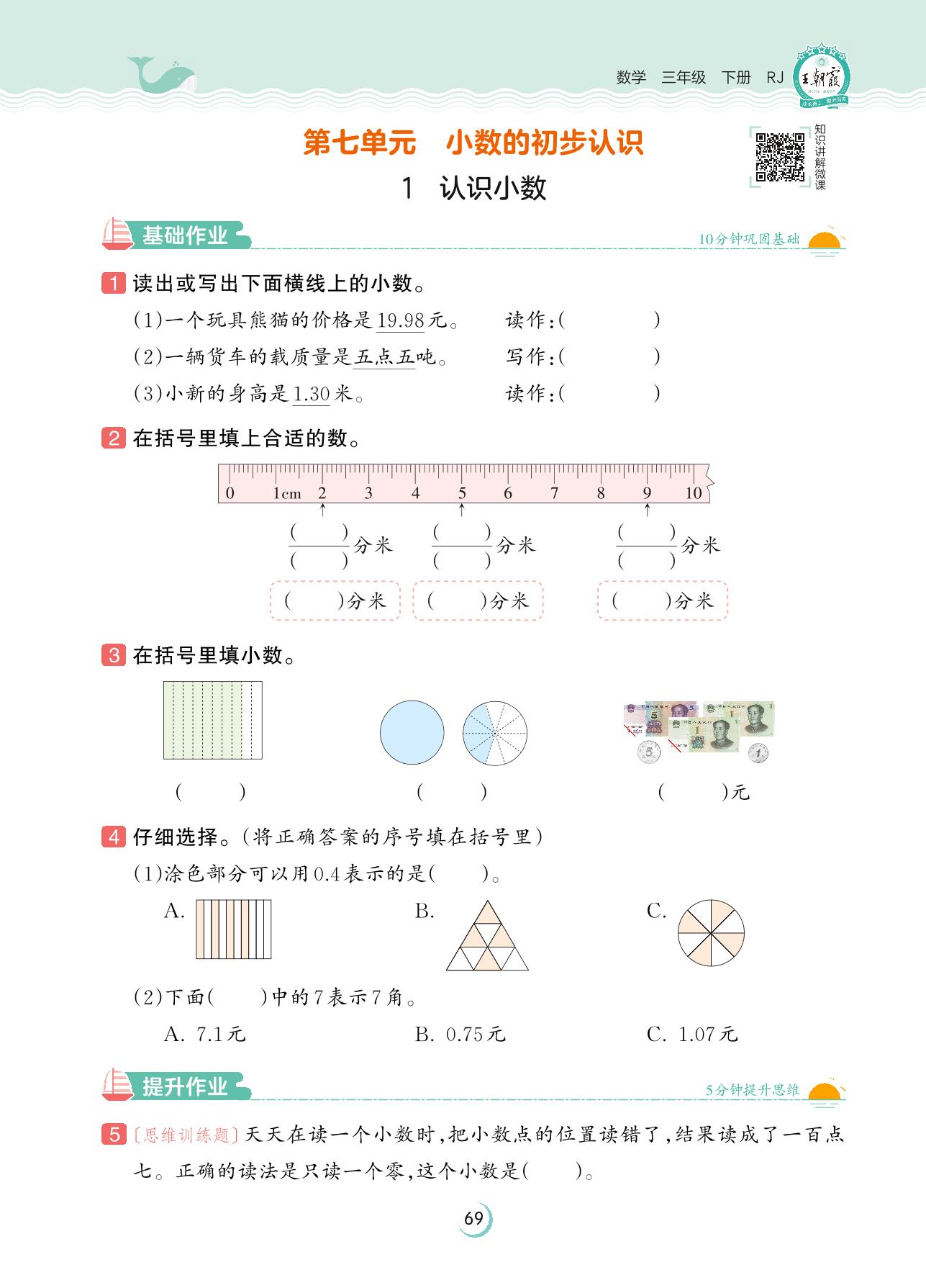 2023下册三年级数学人教版 第七单元 小数的初步认识——1 认识小数