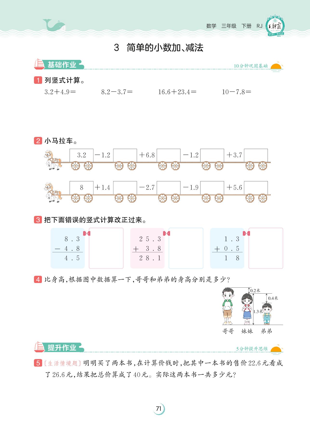 2023下册三年级数学人教版 第七单元 小数的初步认识——3 简单的小数加、减法