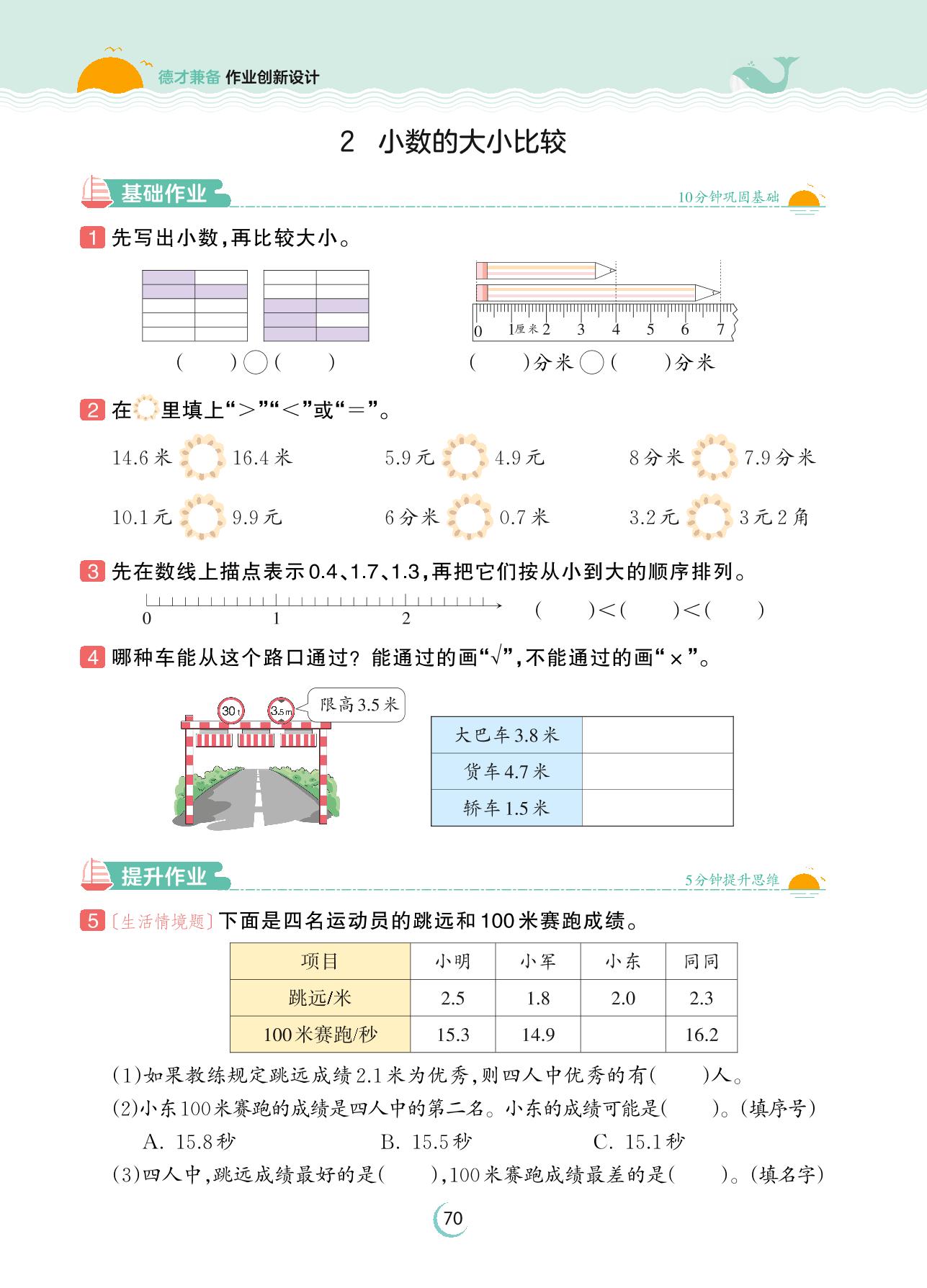 2023下册三年级数学人教版 第七单元 小数的初步认识——2 小数的大小比较