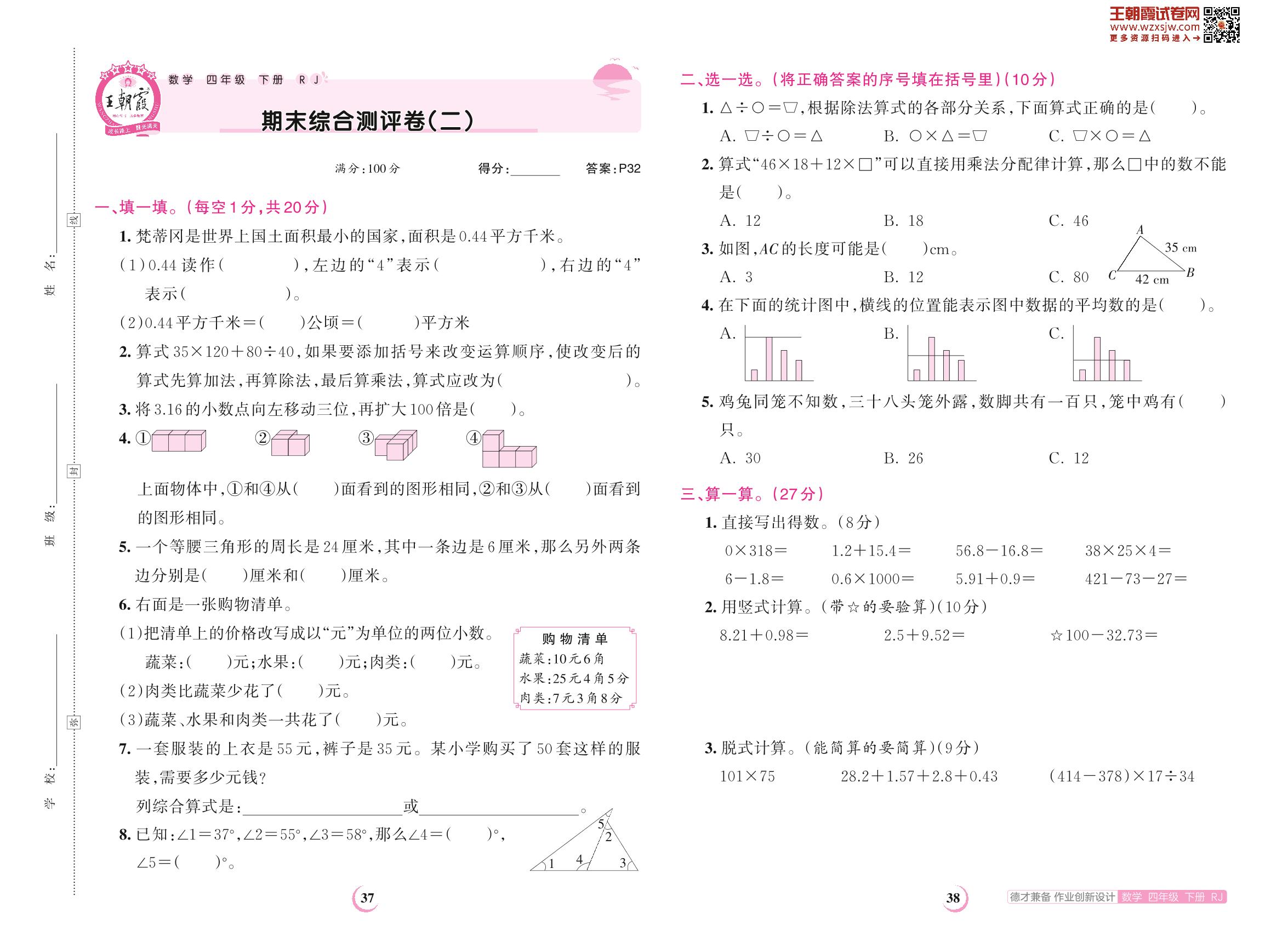 2023下册四年级数学人教版 期末综合测评卷(二)