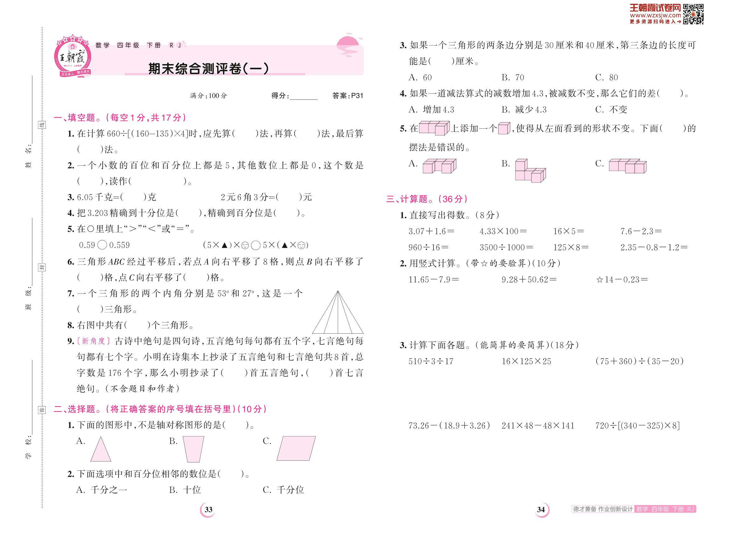 2023下册四年级数学人教版 期末综合测评卷(一)