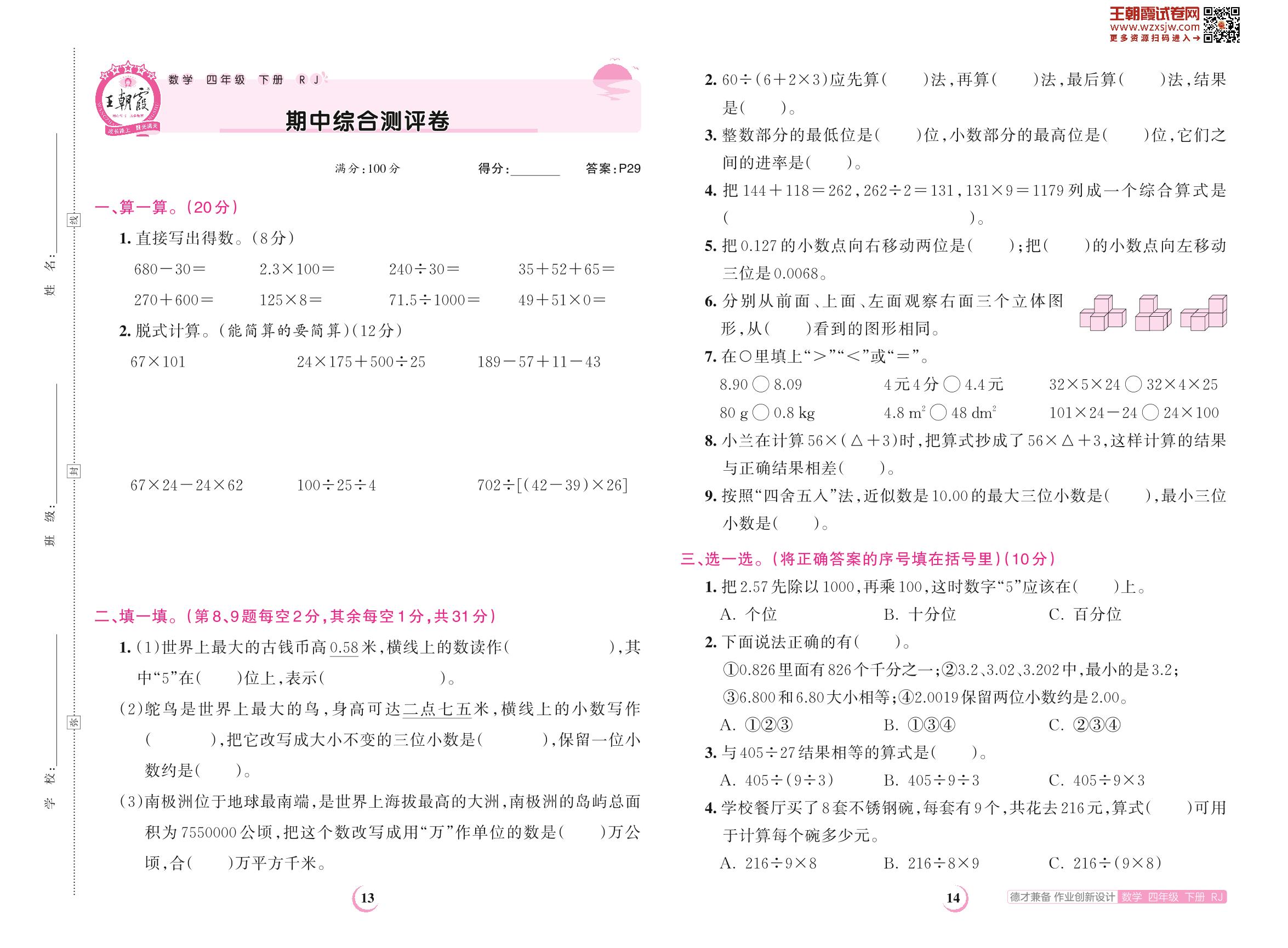 2023下册四年级数学人教版 期中综合测评卷