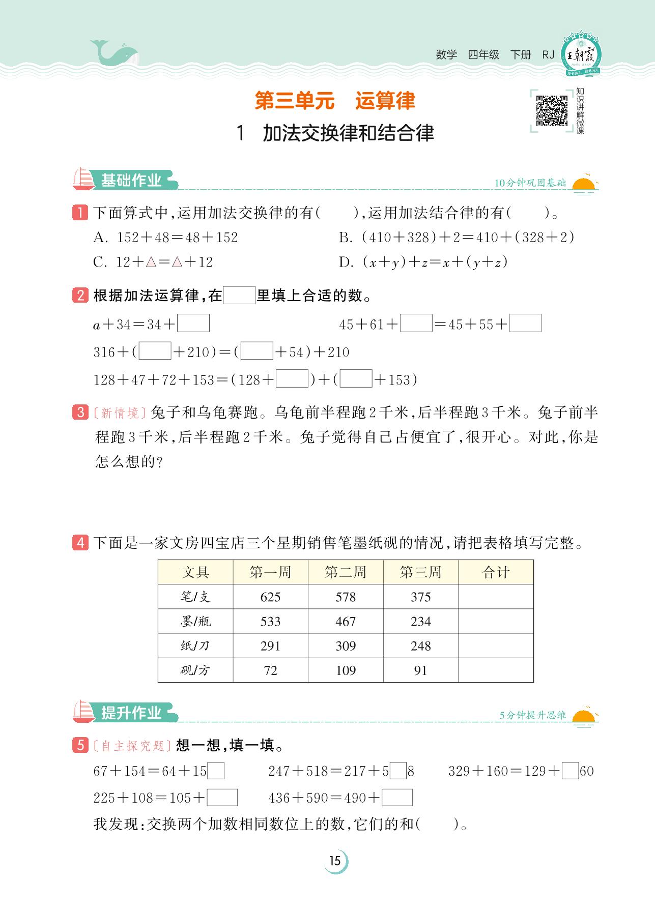 2023下册四年级数学人教版 第三单元 运算律——1 加法交换律和结合律
