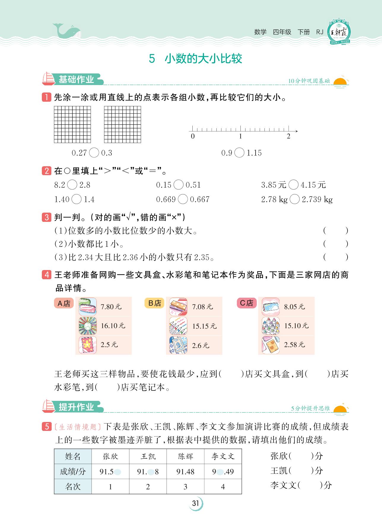 2023下册四年级数学人教版 第四单元 小数的意义和性质——5 小数的大小比较