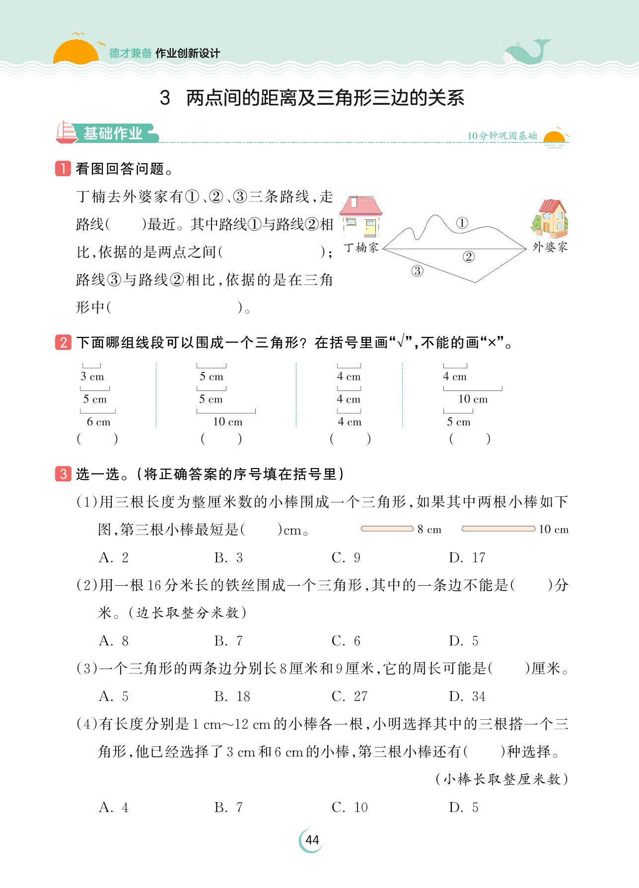 2023下册四年级数学人教版 第五单元 三角形——3 两点间的距离及三角形三边的关系