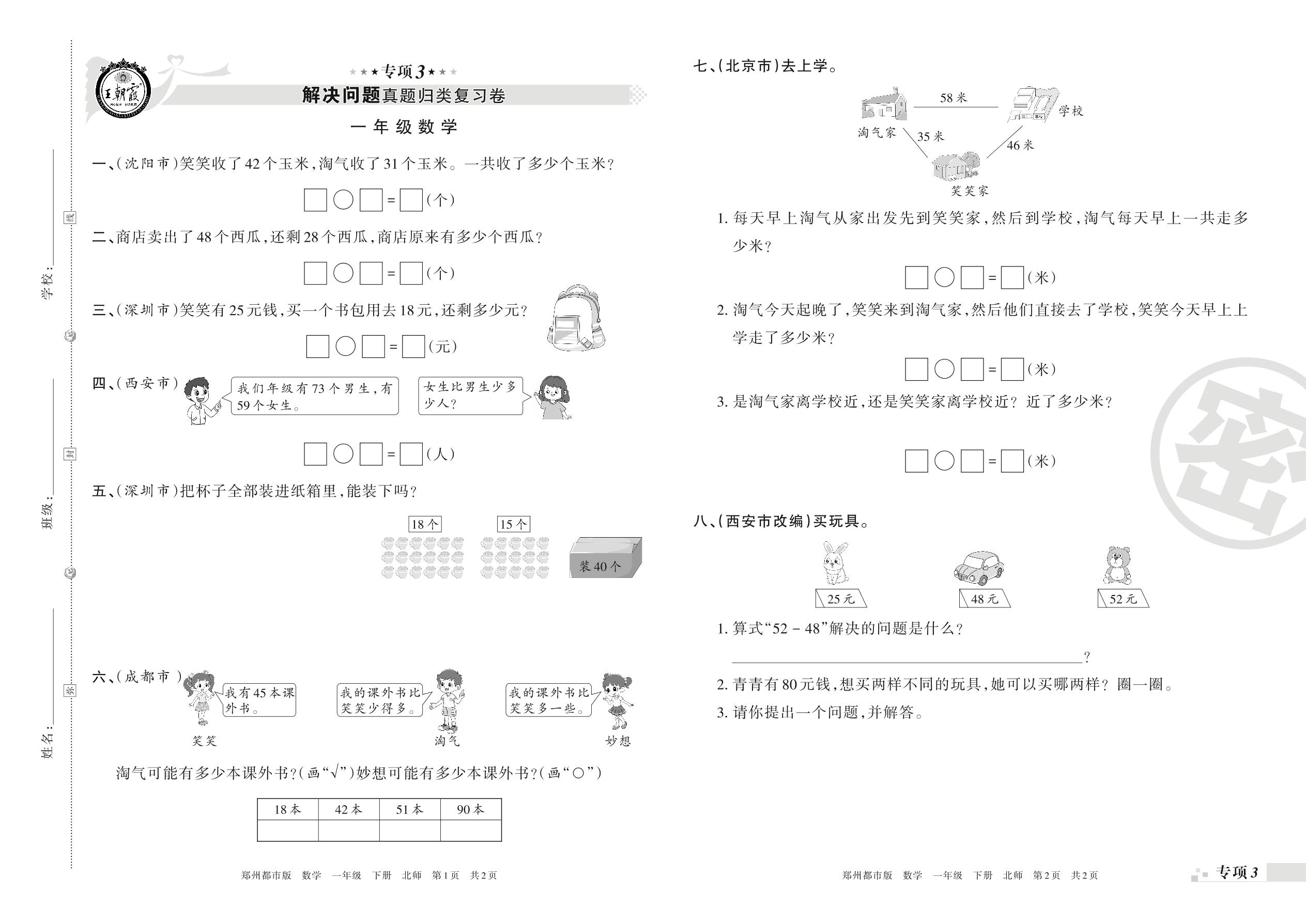 王朝霞期末专项卷——解决问题真题归类复习、新颖题速递:生活与数学一年级下册数学(北师版)_R210802205255【0】