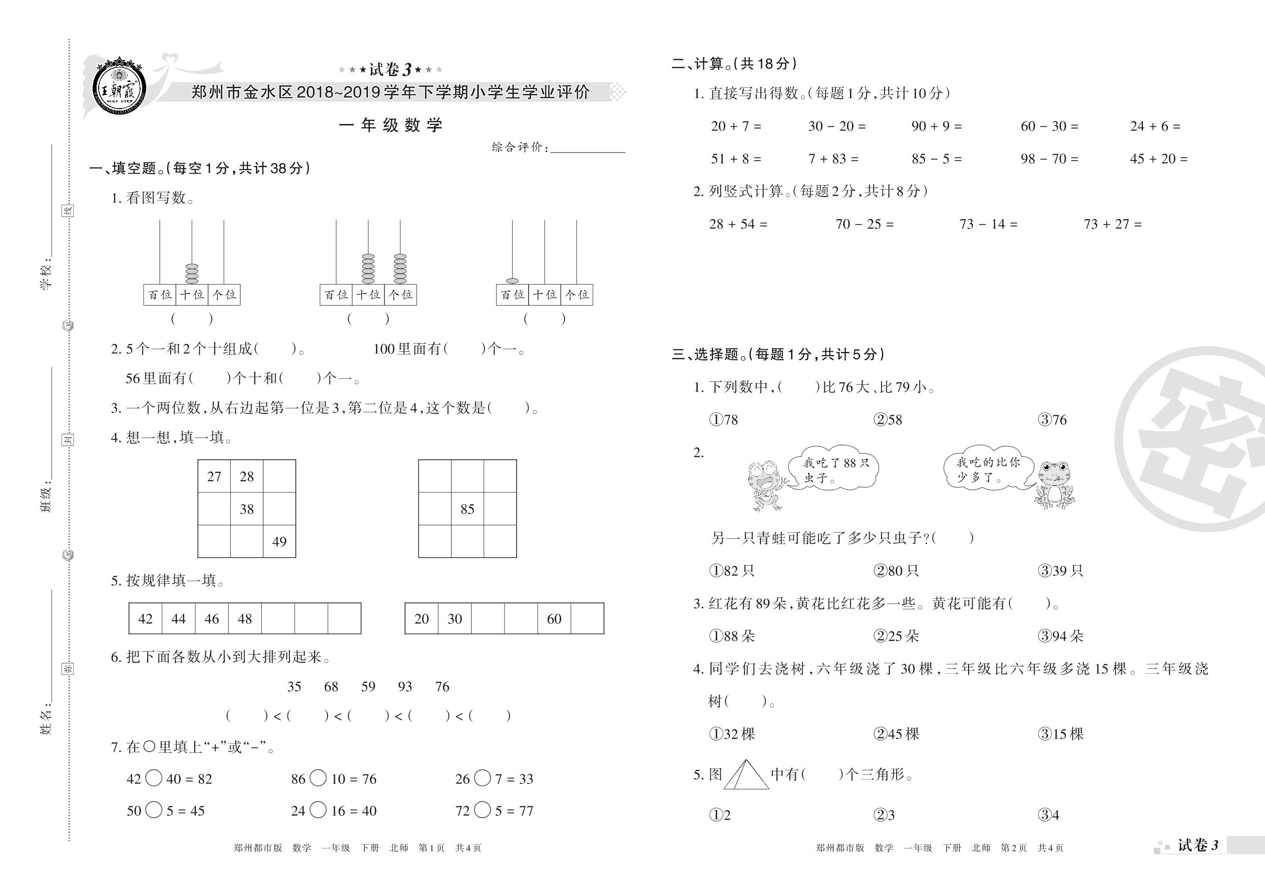 2018-2019学年第二学期郑州市金水区一年级数学试卷(北师版)【3】