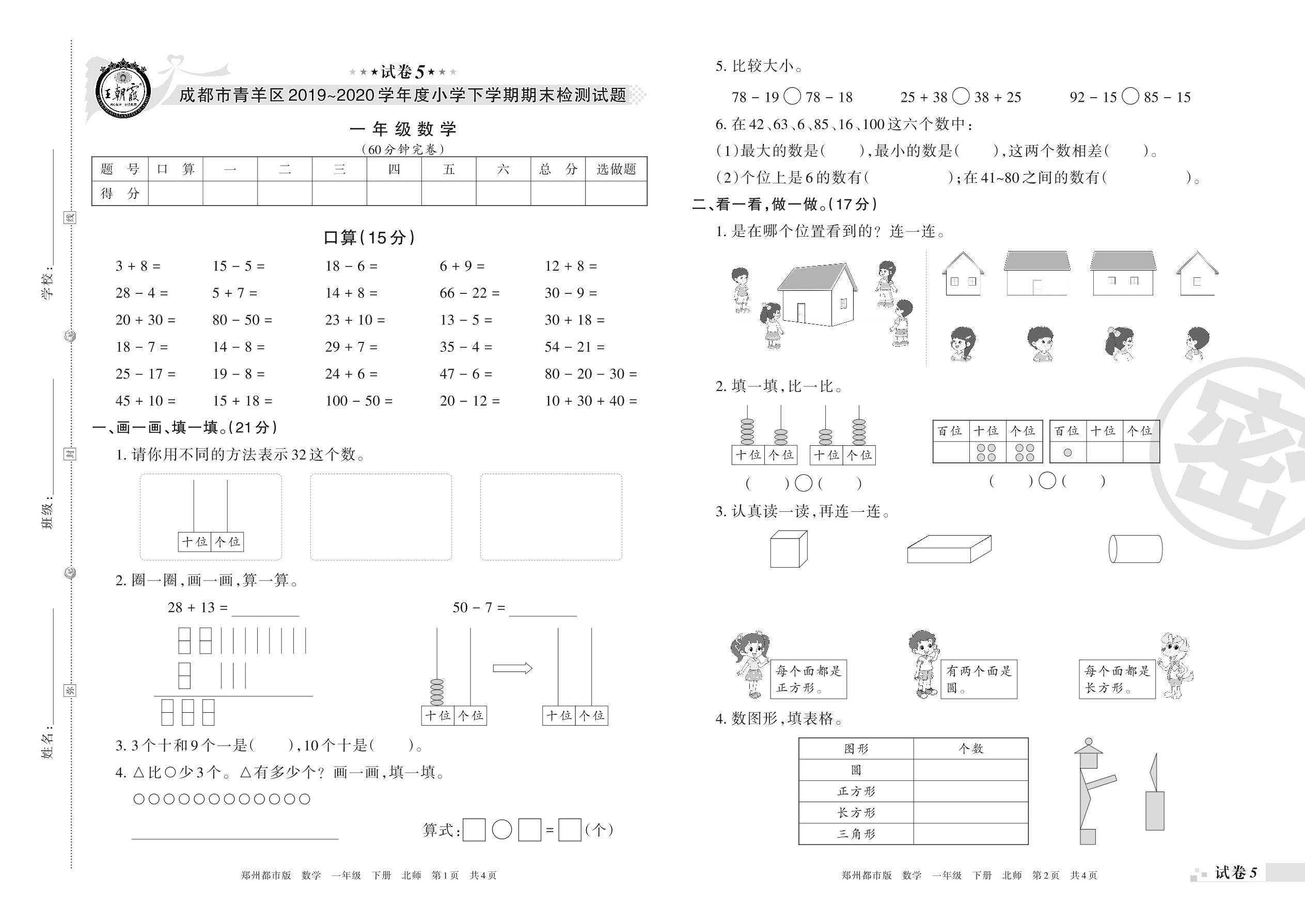 2019-2020学年第二学期成都市青羊区一年级数学试卷(北师版)【5】