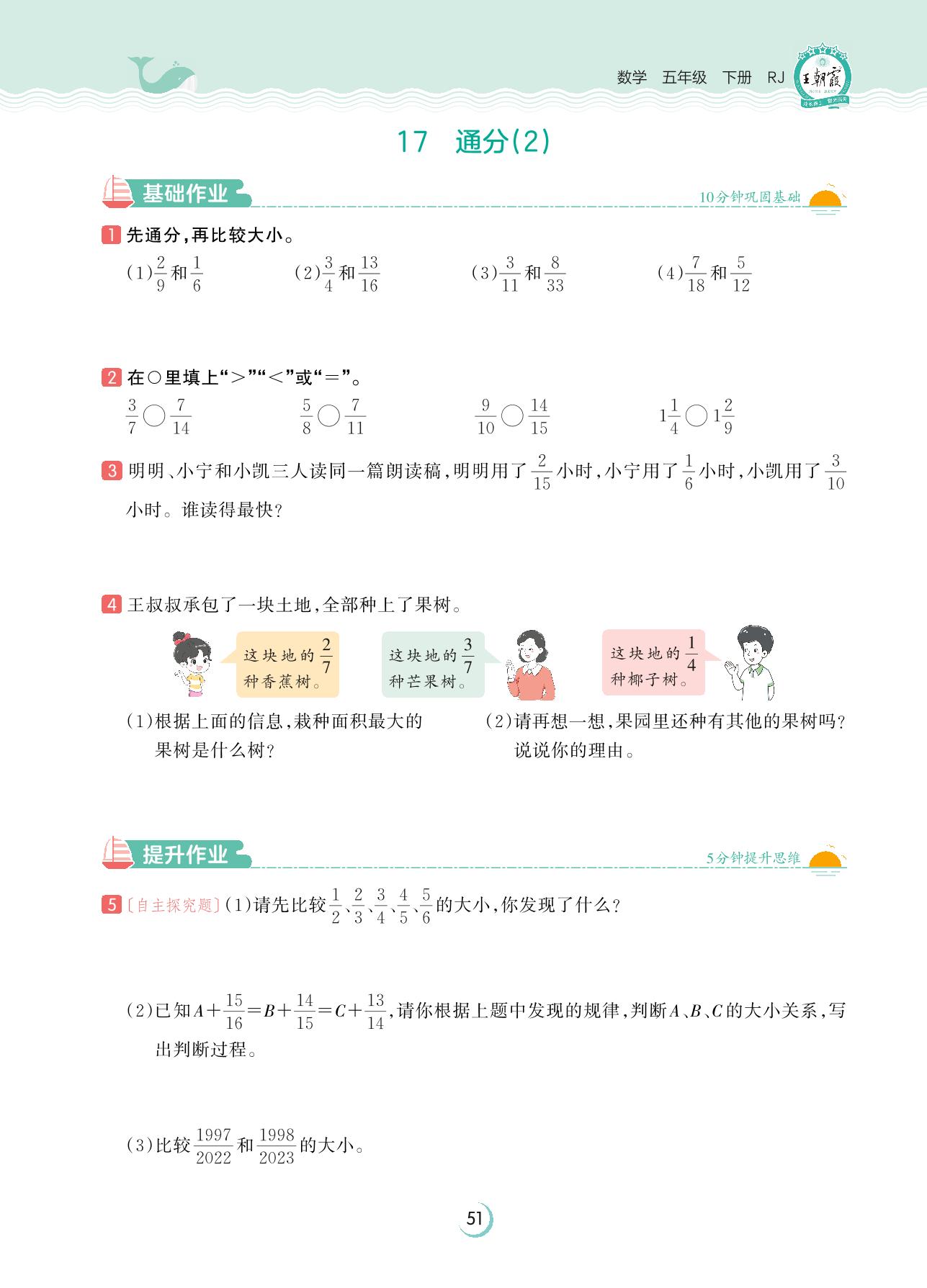 2023下册五年级数学人教版 第四单元 分数的意义和性质——17 通分(2)