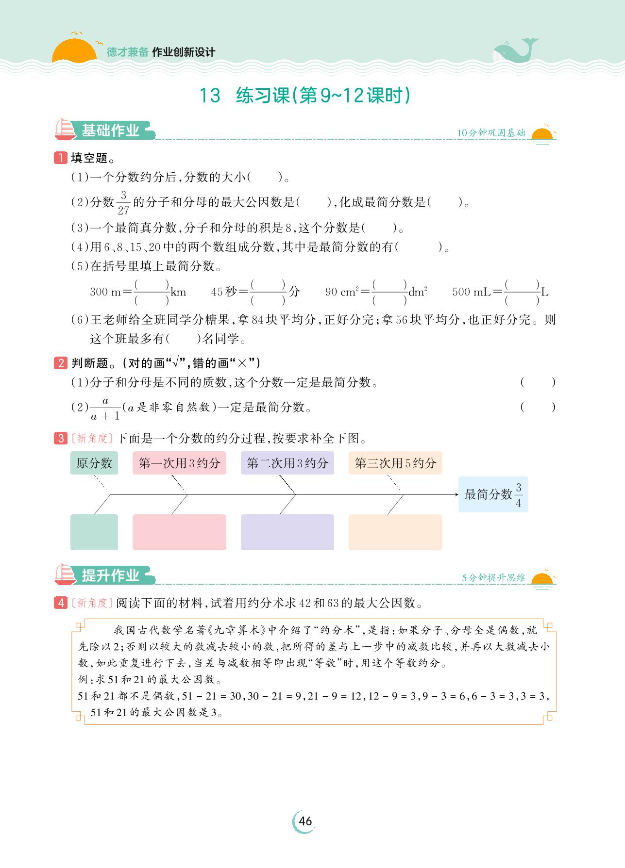 2023下册五年级数学人教版 第四单元 分数的意义和性质——13 练习课(第9~12课时)