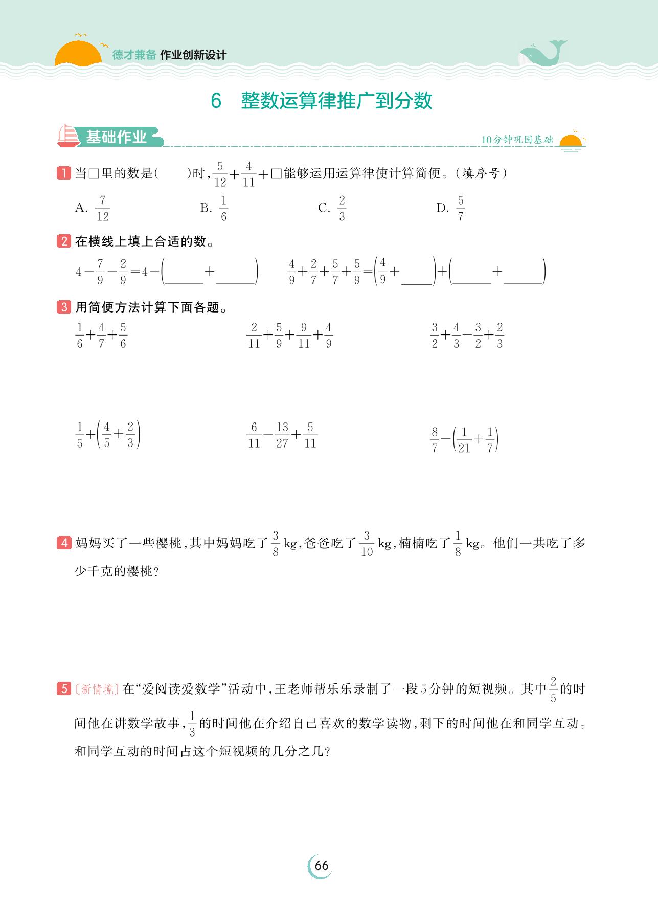 2023下册五年级数学人教版 第六单元 分数的加法和减法——6 整数运算律推广到分数