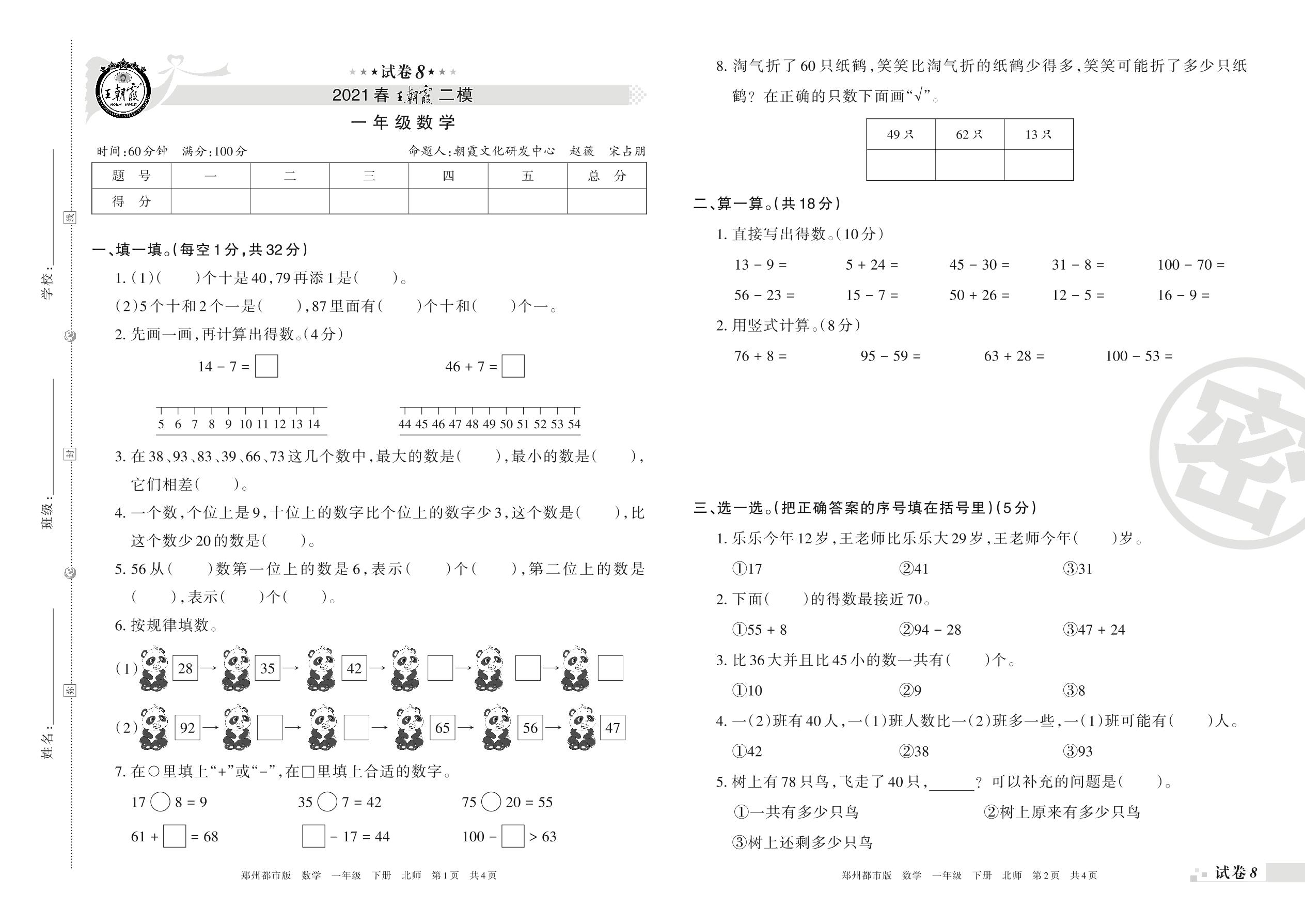 王朝霞期末模拟卷一年级下册数学(北师版)_R210802205324【8】