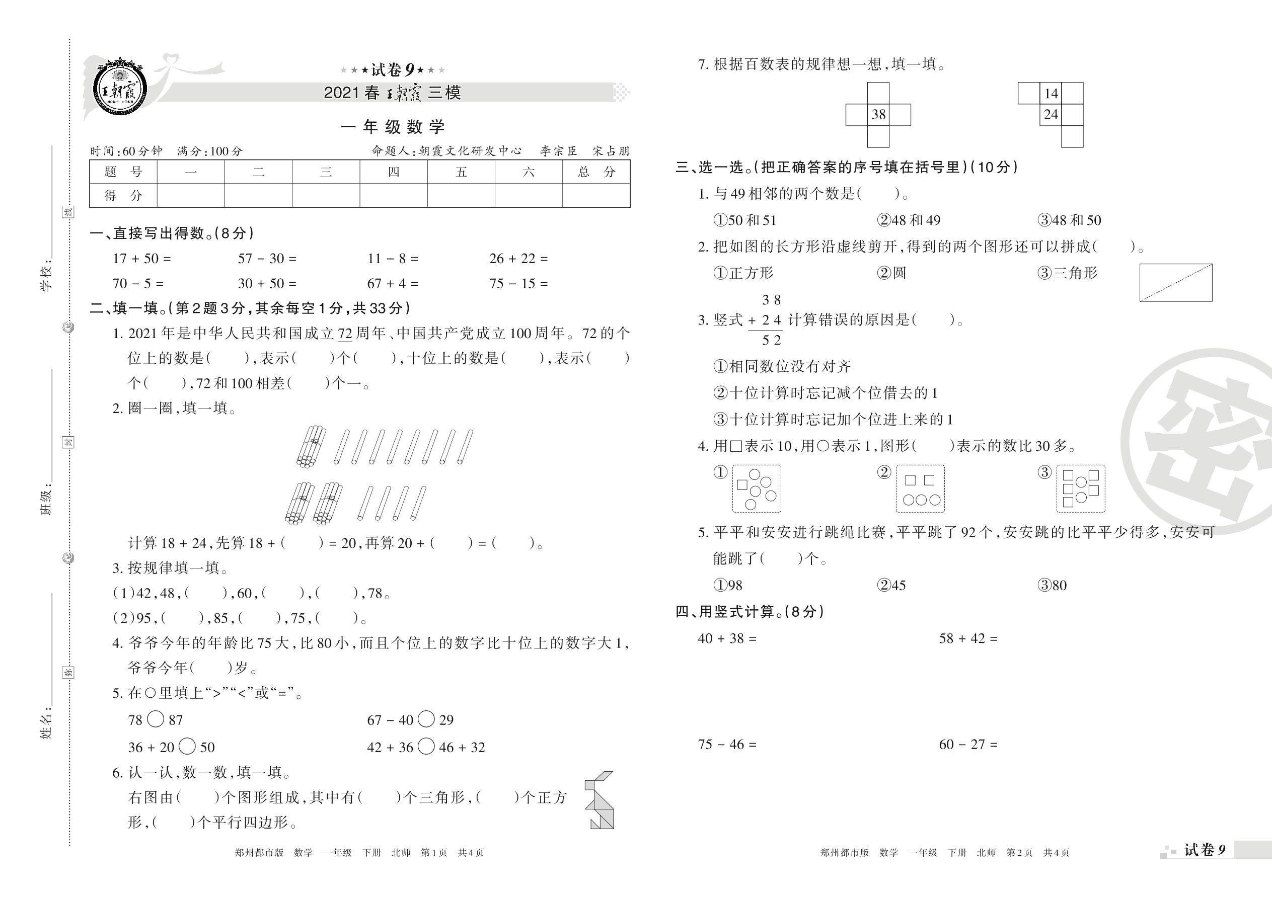 王朝霞期末模拟卷一年级下册数学(北师版)_R210802205329【9】