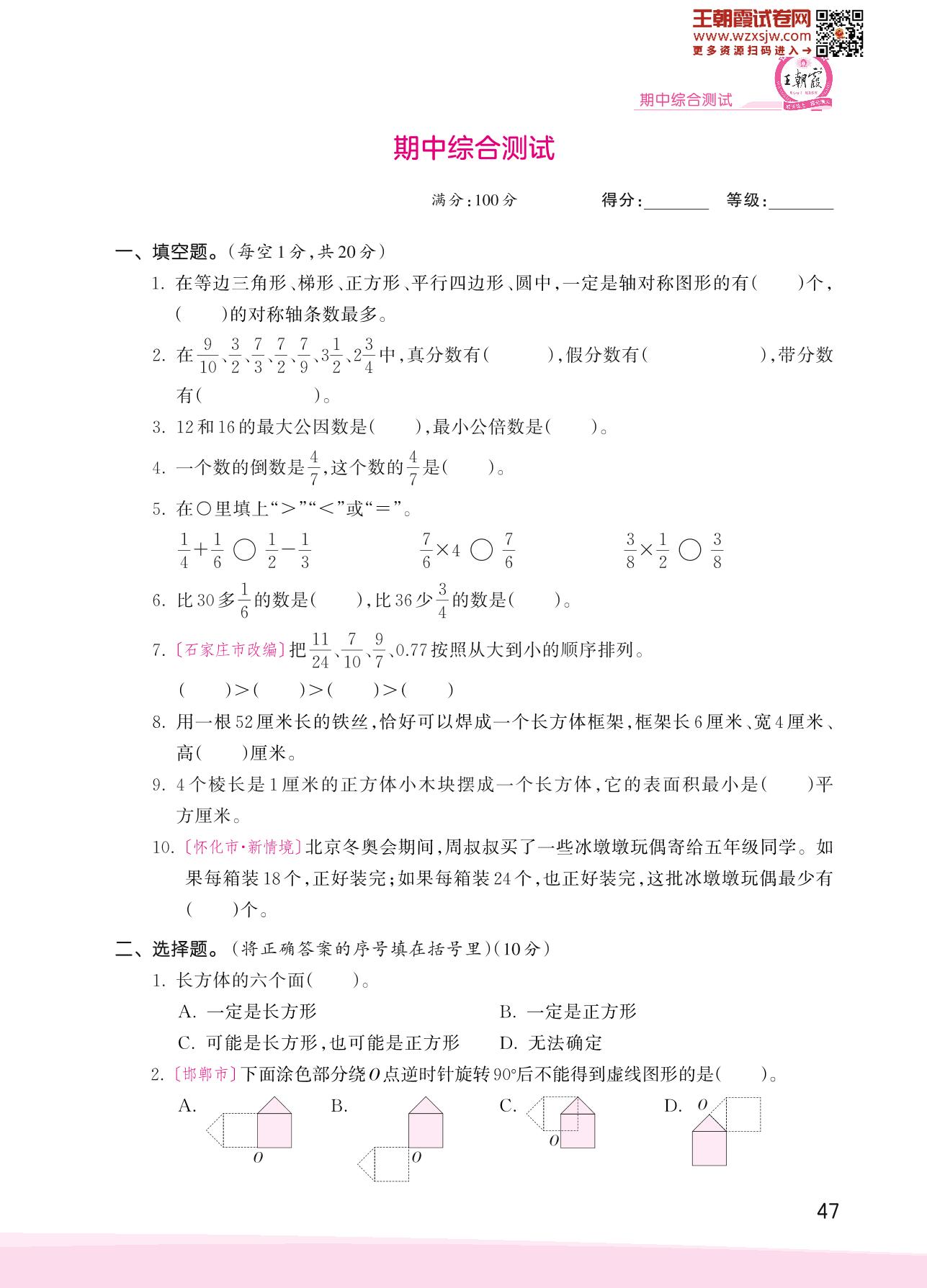 五年级数学冀教版下册期中卷