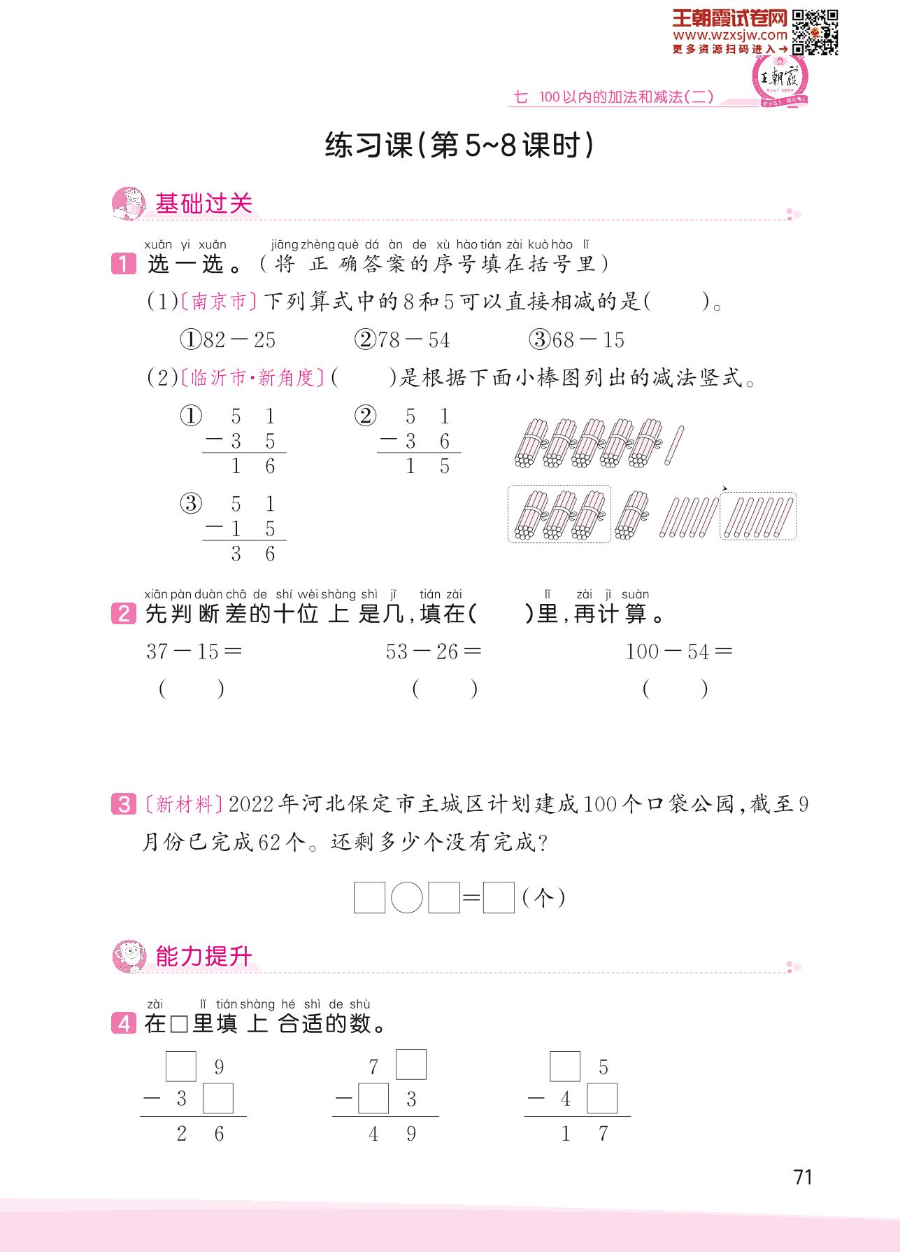 2023下册一年级数学冀教版 七 100以内的加法和减法(二)——练习课(第5~8课时)