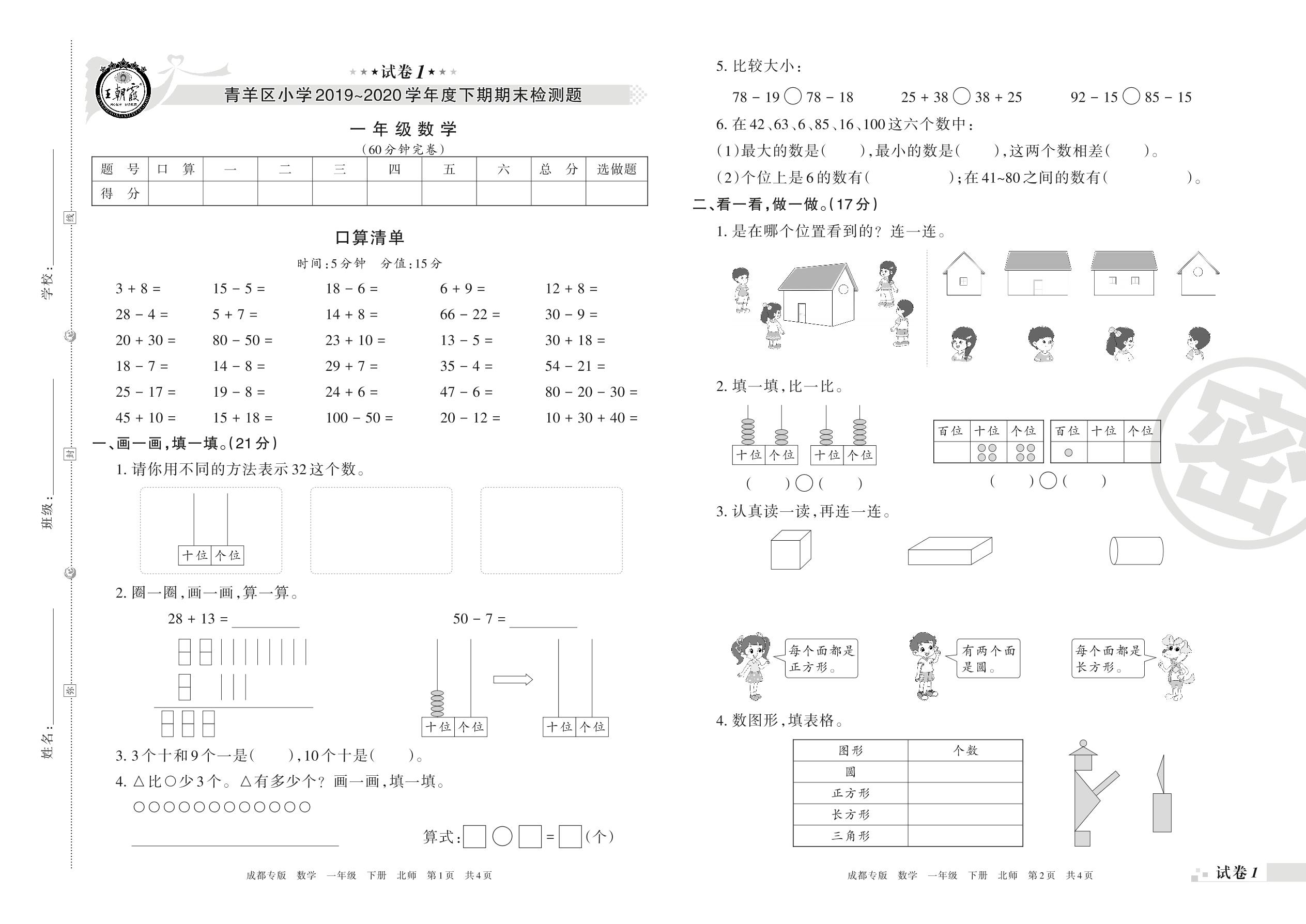 2019-2020学年第二学期成都市青羊区一年级数学试卷(北师版)【1】