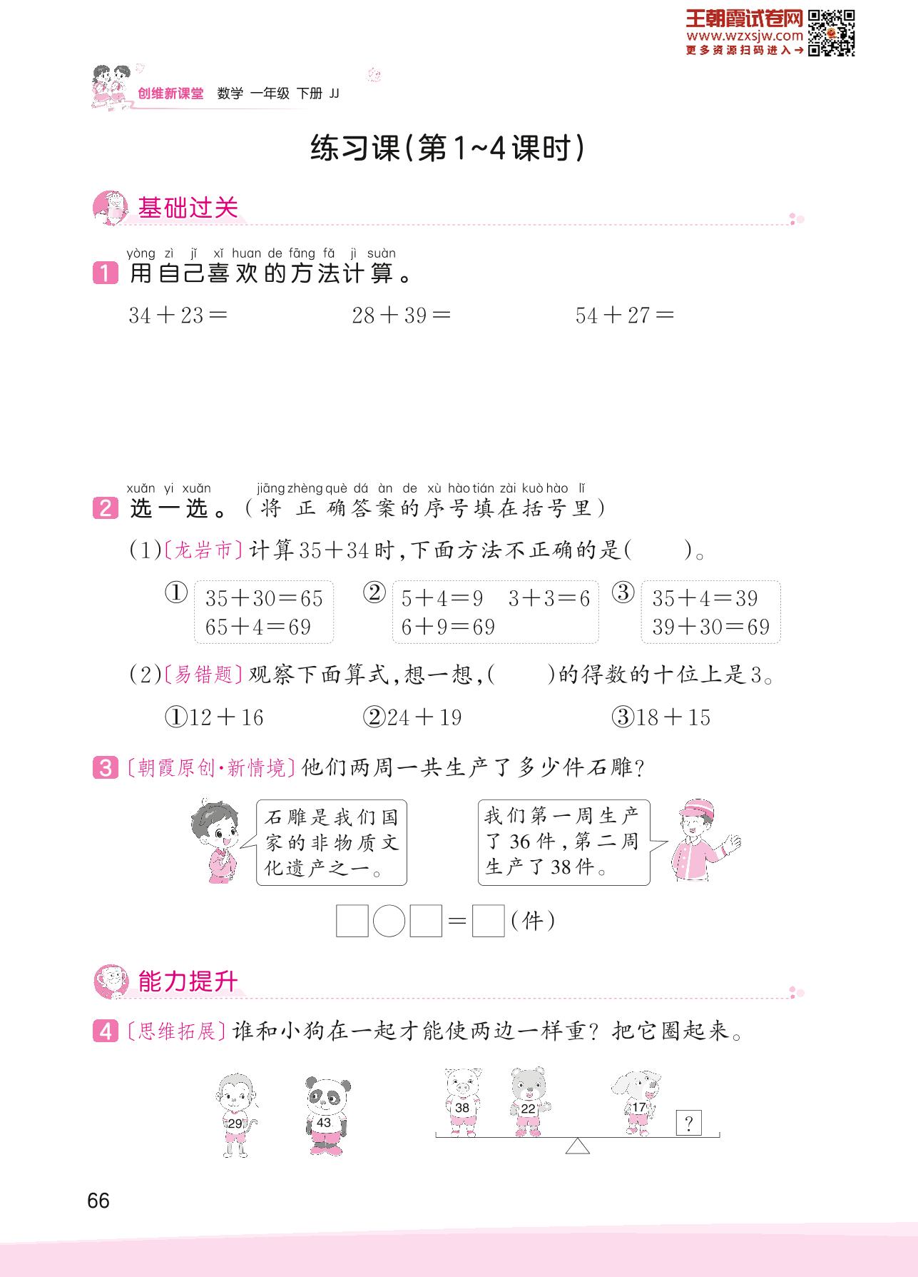 2023下册一年级数学冀教版 七 100以内的加法和减法(二)——练习课(第1~4课时)