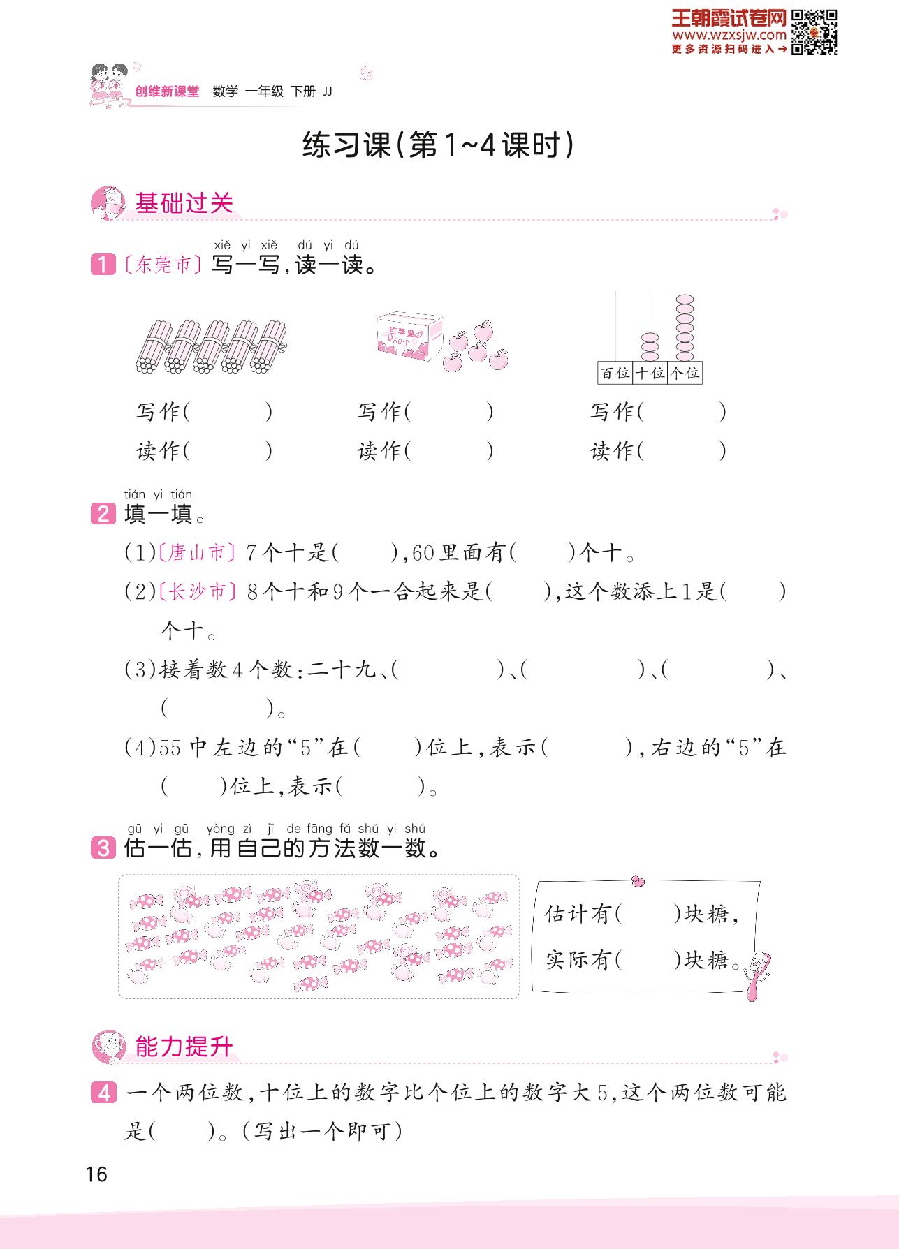 2023下册一年级数学冀教版 三 100以内数的认识——练习课(第1~4课时)