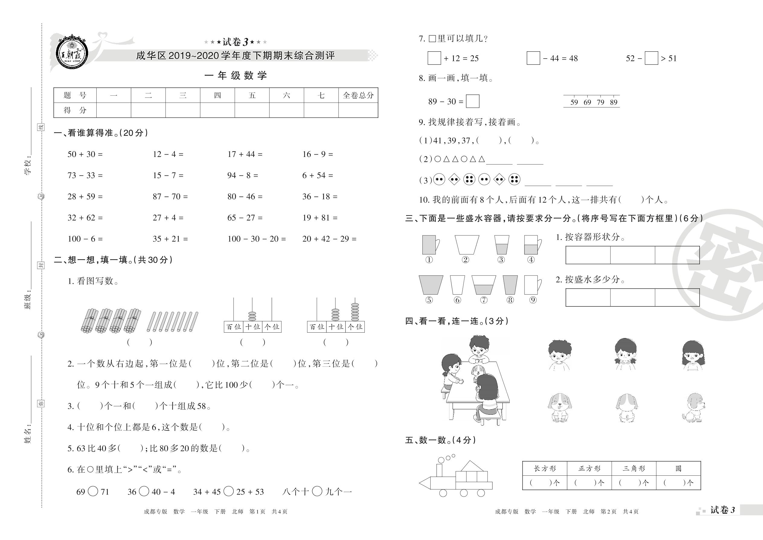 2019-2020学年第二学期成都市成华区一年级数学试卷(北师版)【3】