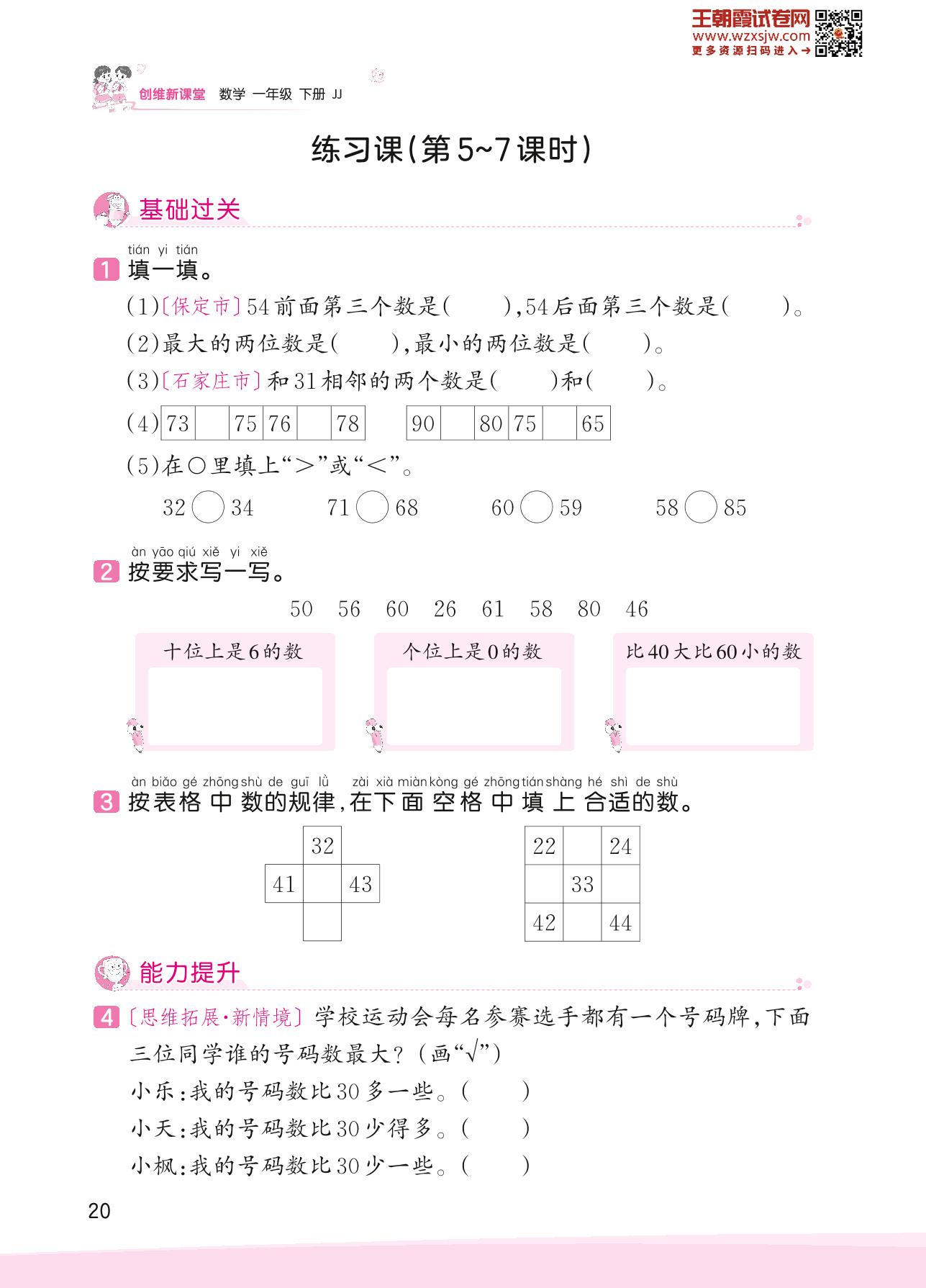 2023下册一年级数学冀教版 三 100以内数的认识——练习课(第5~7课时)