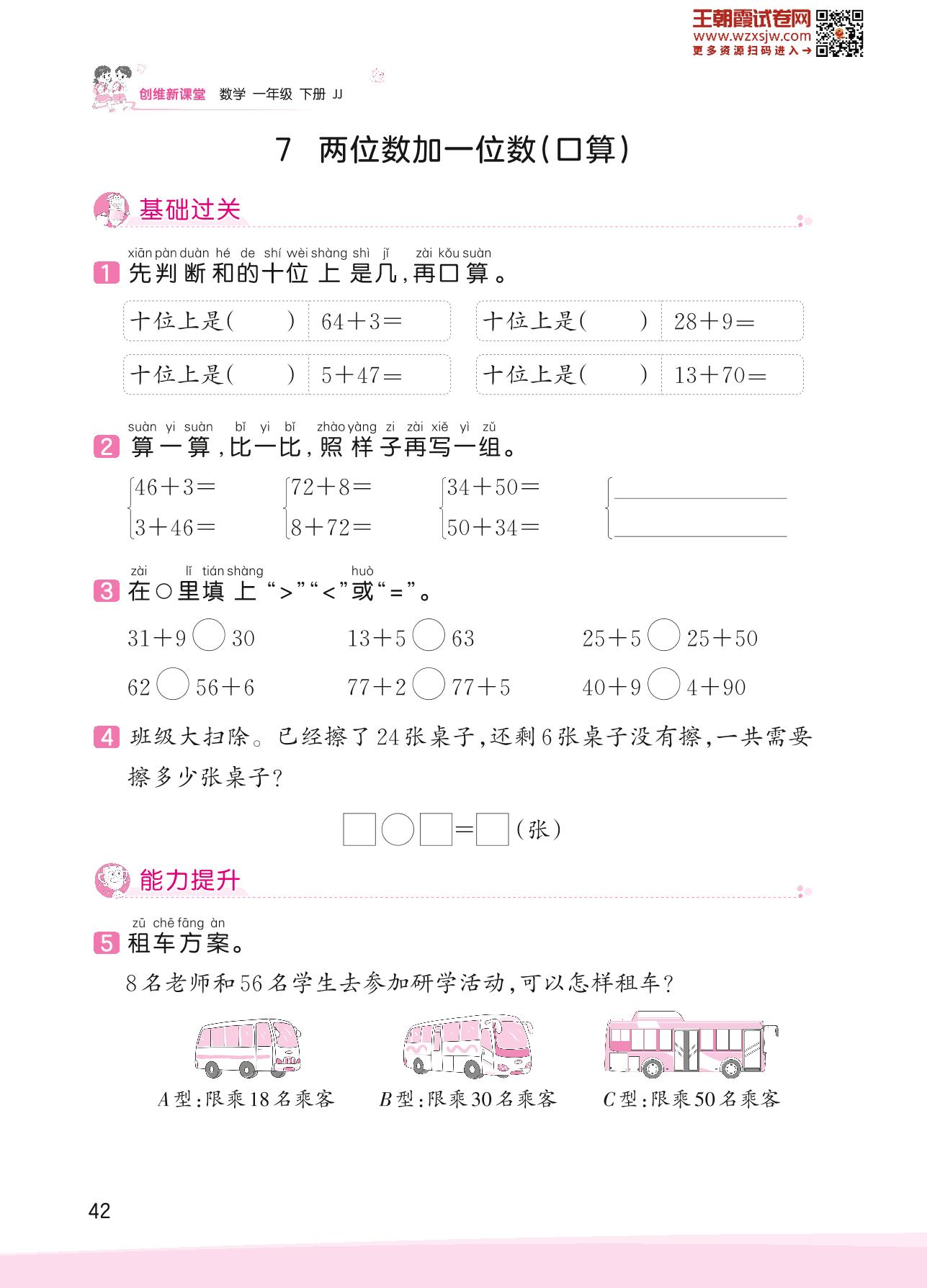 2023下册一年级数学冀教版 五 100以内的加法和减法(一)——7 两位数加一位数(口算)