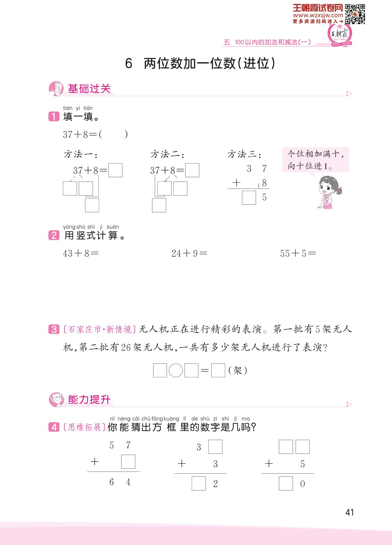 2023下册一年级数学冀教版 五 100以内的加法和减法(一)——6 两位数加一位数(进位)