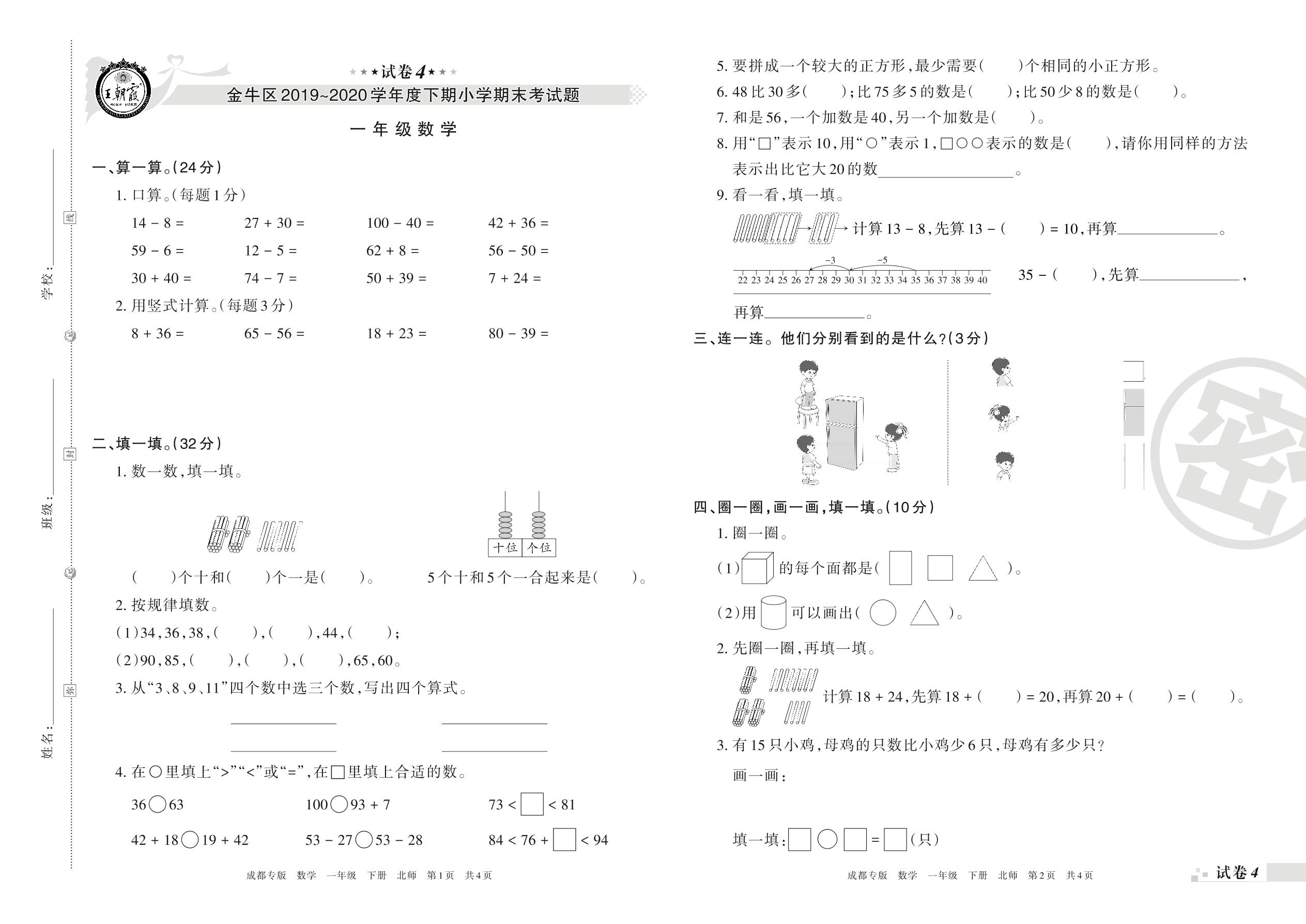 2019-2020学年第二学期成都市金牛区一年级数学试卷(北师版)【4】