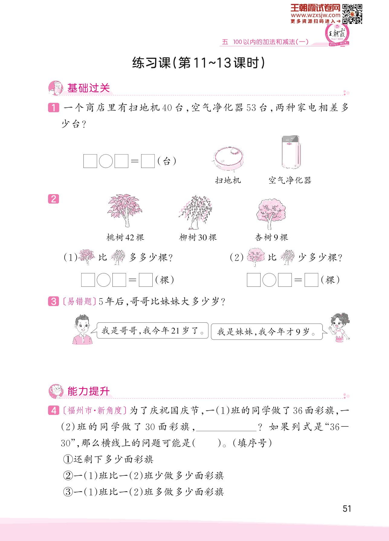 2023下册一年级数学冀教版 五 100以内的加法和减法(一)——练习课(第11~13课时)