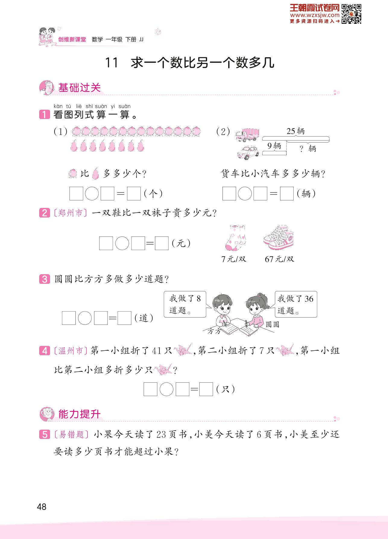 2023下册一年级数学冀教版 五 100以内的加法和减法(一)——11 求一个数比另一个数多几